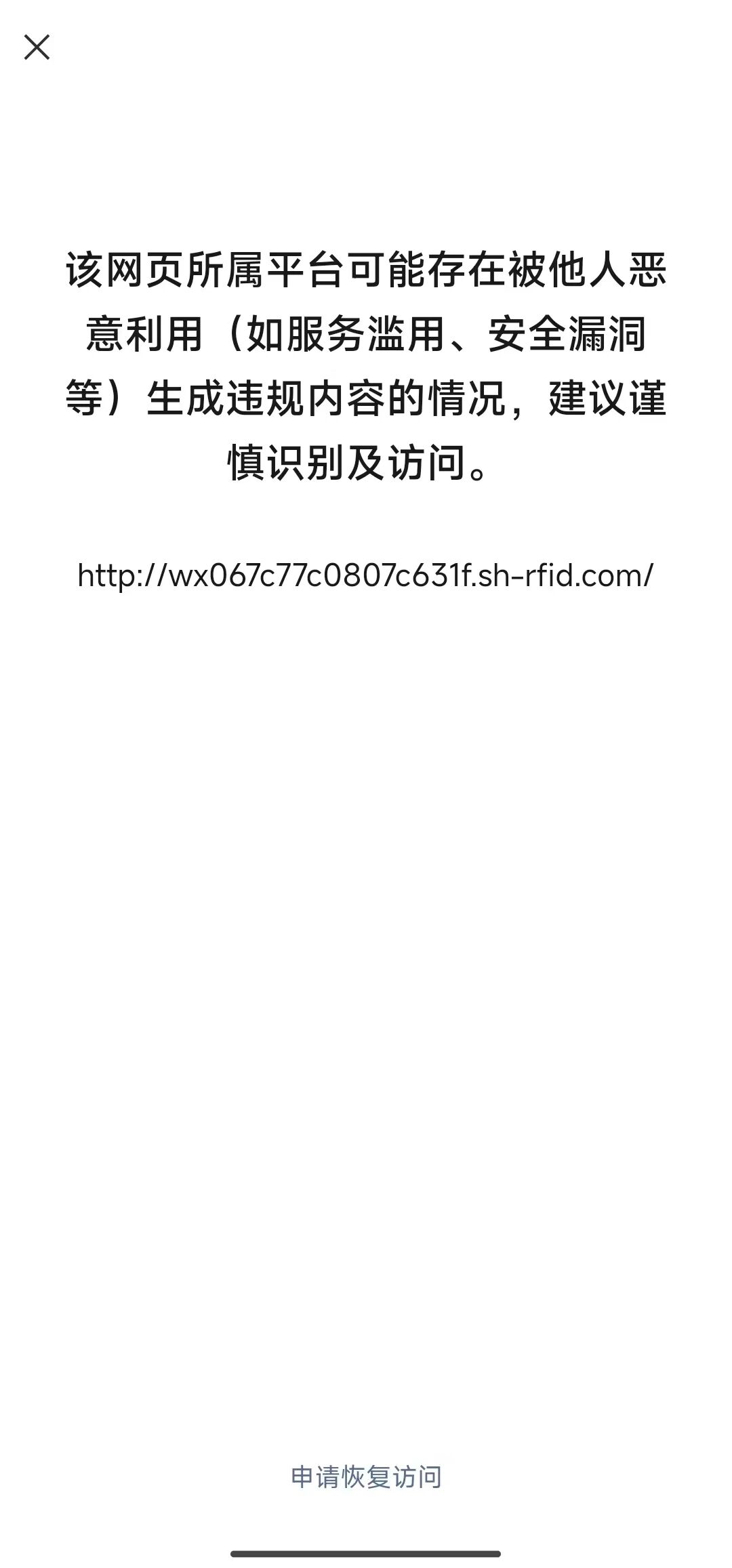 你好,经核实域名 sh-rfid.com下的链接【http://nfttest.sh-rfid.com/?2254490,141,ek 】的内容违反《微信外部链接内容管理规范》,现经核实相关违规内容已修改,现予已恢复微信内直接访问的服务,请耐心等待,另核实该域名存在安全漏洞,建议修复相关漏洞,避免再次违规,请知悉。