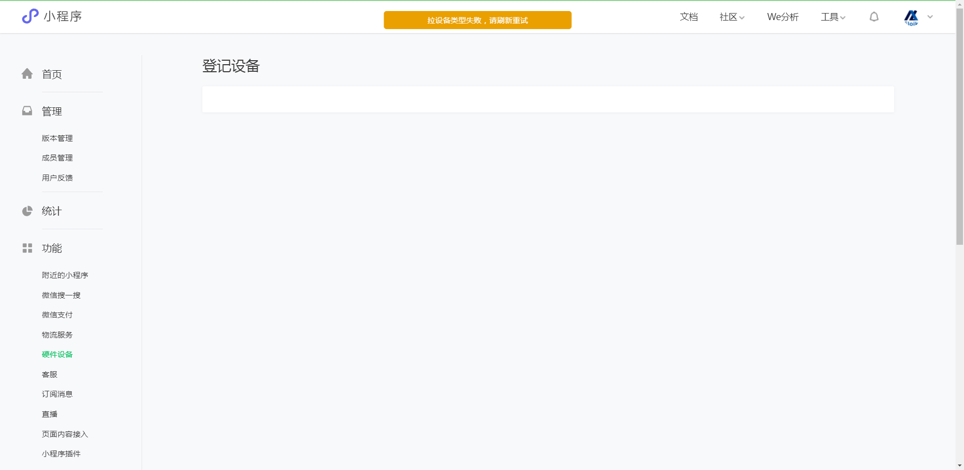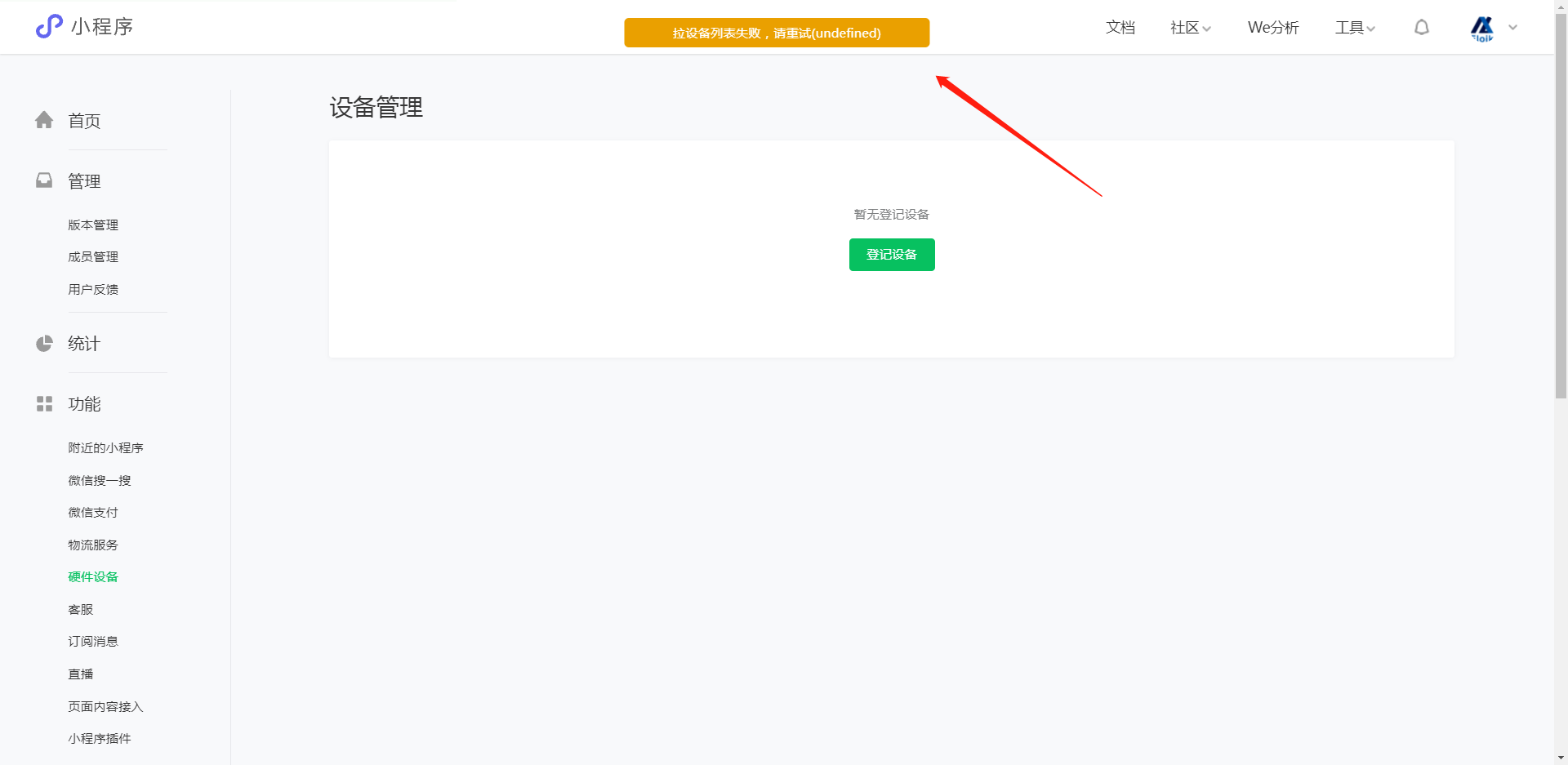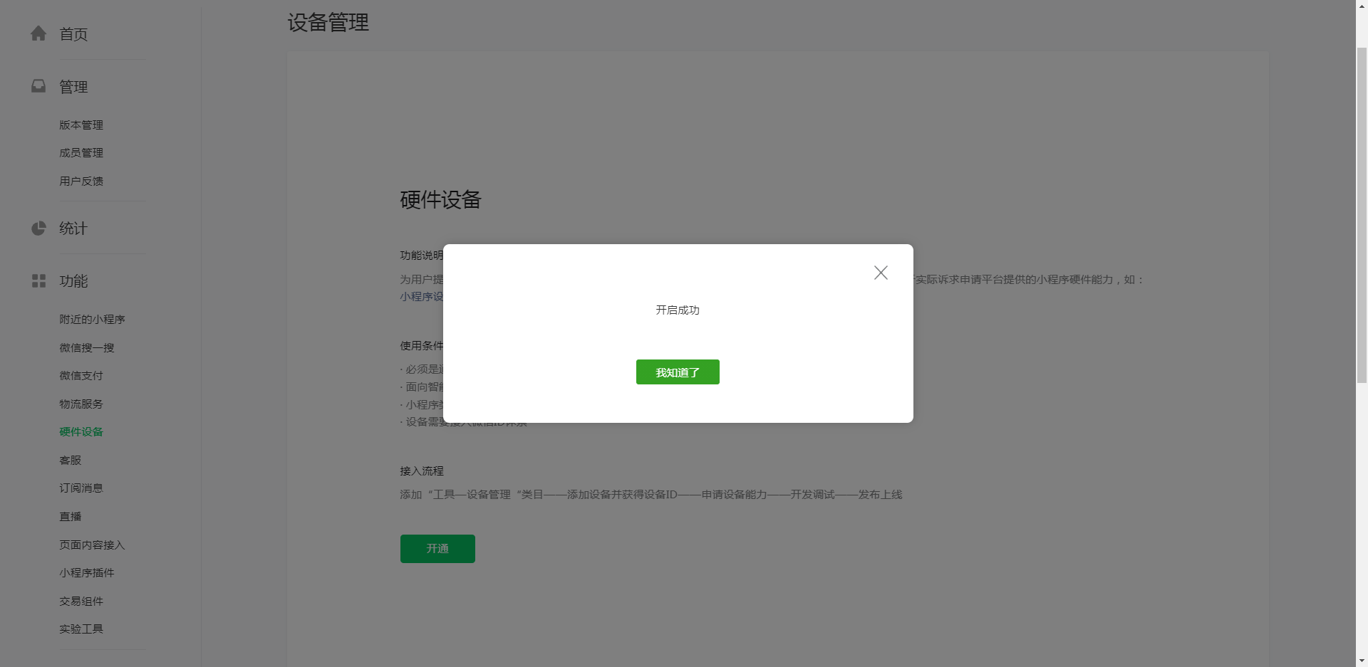 大家好,官方工作人员你们好,小程序的设备消息功能在添加服务类目为工具>设备管理之后去开通“功能>硬件设备”的时候出现异常,有劳看看怎么处理,应该是22号开通的,之后添加了一个设备,前天看的是在审核中,昨天看的也是在审核中,今天再看就变成了需要去开通,然后再添加设备的时候出现报错。有劳看看怎么处理。