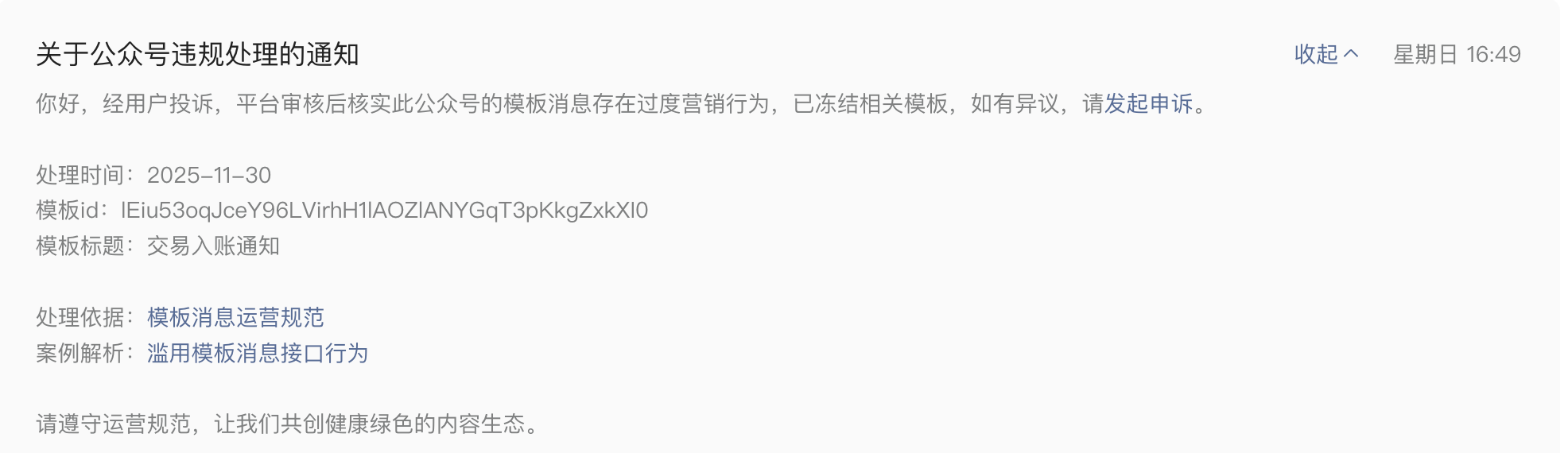 我们公众号被恶意投诉后模板消息功能被封禁,想了解具体违规的内容,以及具体违规了哪一项,我们需要进行对标申诉