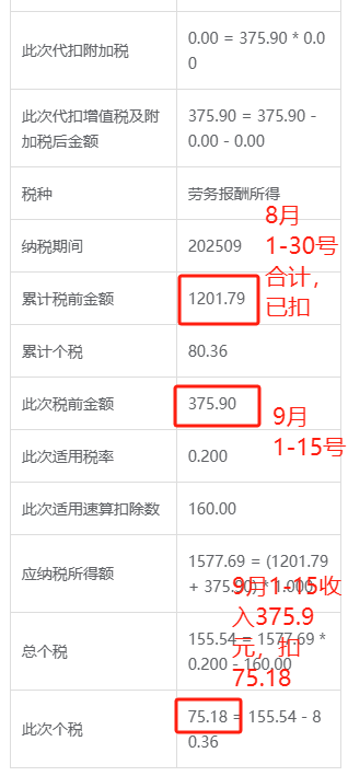 我公众号9月1-15号收益375.9元,扣除个税75.18元,怎么扣的?不是达到800+才会扣税吗?8月1-30号合计收益1201.79元,上月已分别扣除个税,怎么会反复累加扣税?请看截图,哪位老师帮忙解答一下,谢谢