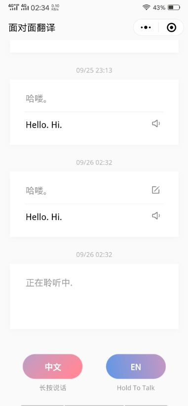 1、按正常流程完成一次翻译(按下-》说话-》等待翻译结果显示出来)
