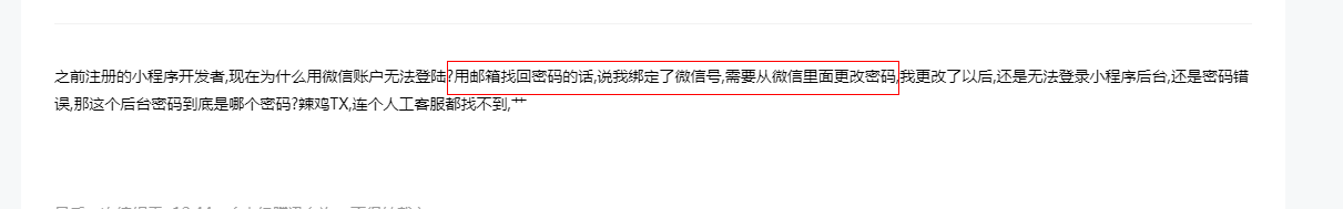 之前注册的小程序开发者,现在为什么用微信账户无法登陆?用邮箱找回密码的话,说我绑定了微信号,需要从微信里面更改密码,我更改了以后,还是无法登录小程序后台,还是密码错误,那这个后台密码到底是哪个密码?辣鸡TX,连个人工客服都找不到,艹