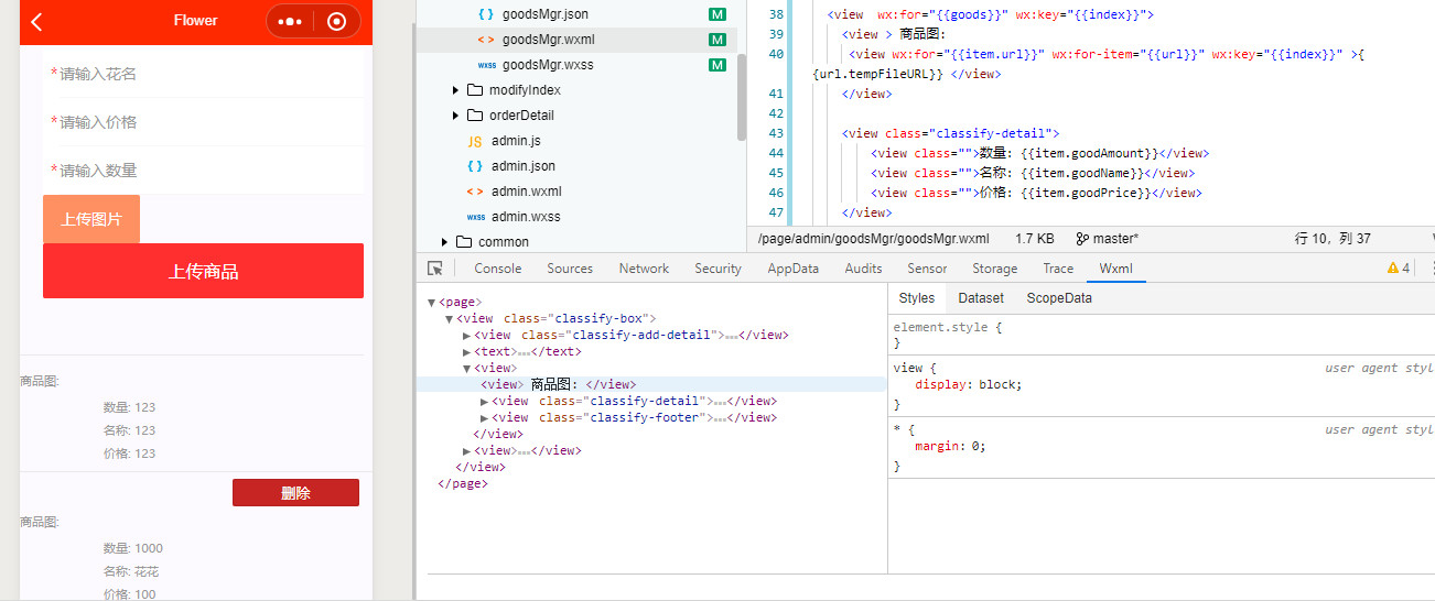 <view wx:for="{{goods}}" wx:key="{{index}}"> <view > 商品图: <view wx:for="{{item.url}}" wx:for-item="{{url}}" wx:key="{{index}}" >{{url.tempFileURL}} </view> </view> <view class="classify-detail"> <view class="">数量: {{item.goodAmount}}</view> <view class="">名称: {{item.goodName}}</view> <view class="">价格: {{item.goodPrice}}</view> </view> <view class="classify-footer"> <button size="mini" class="classify-btn" data-index="{{index}}" bindtap="deleteGoods">删除</button> </view> </view> |