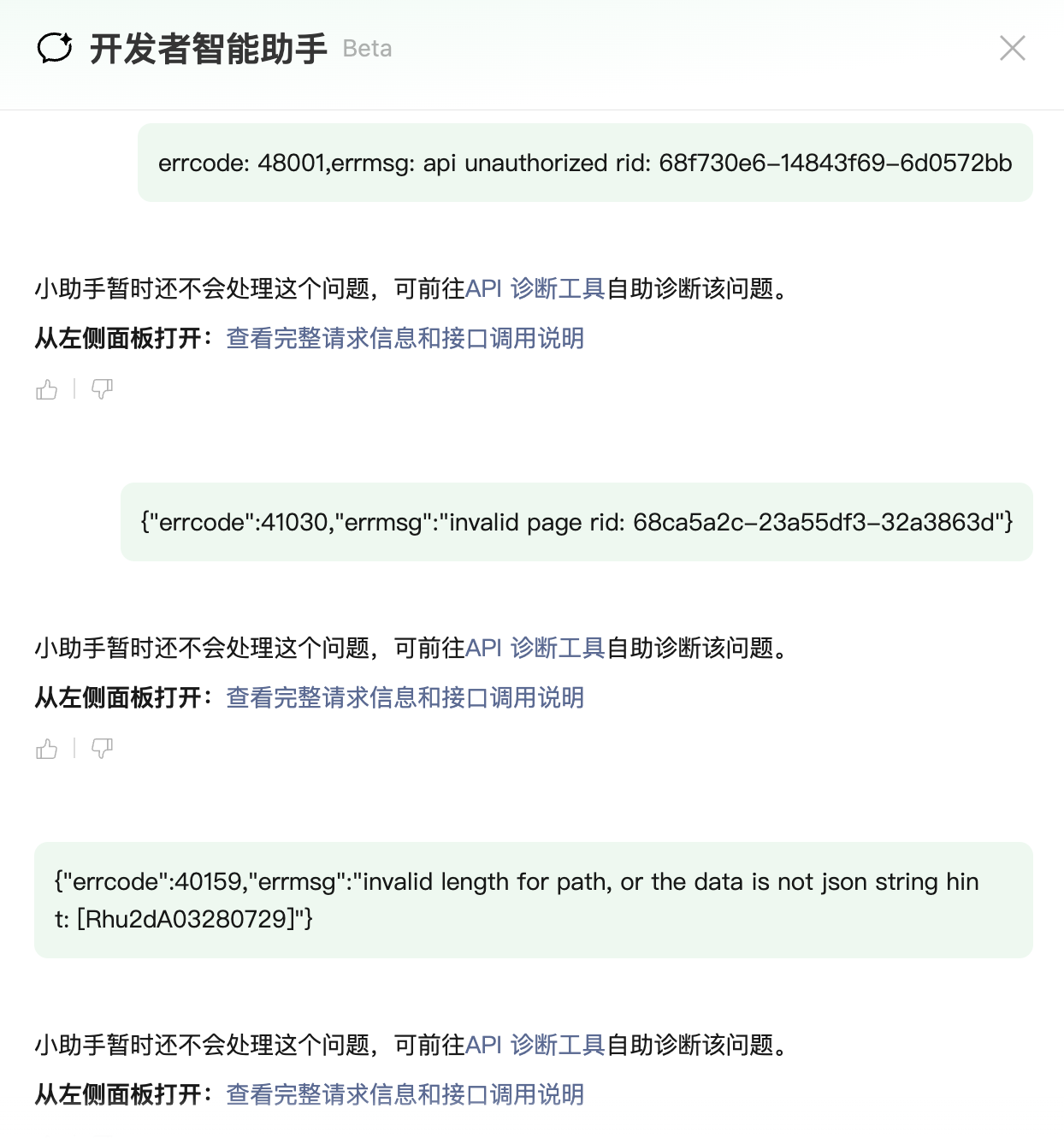 开发者可在 AI 助手中发起智能的 API 诊断,在 AI 对话框中激活「API 诊断」模式,如下截图,输入包含有效 rid 的内容即可。