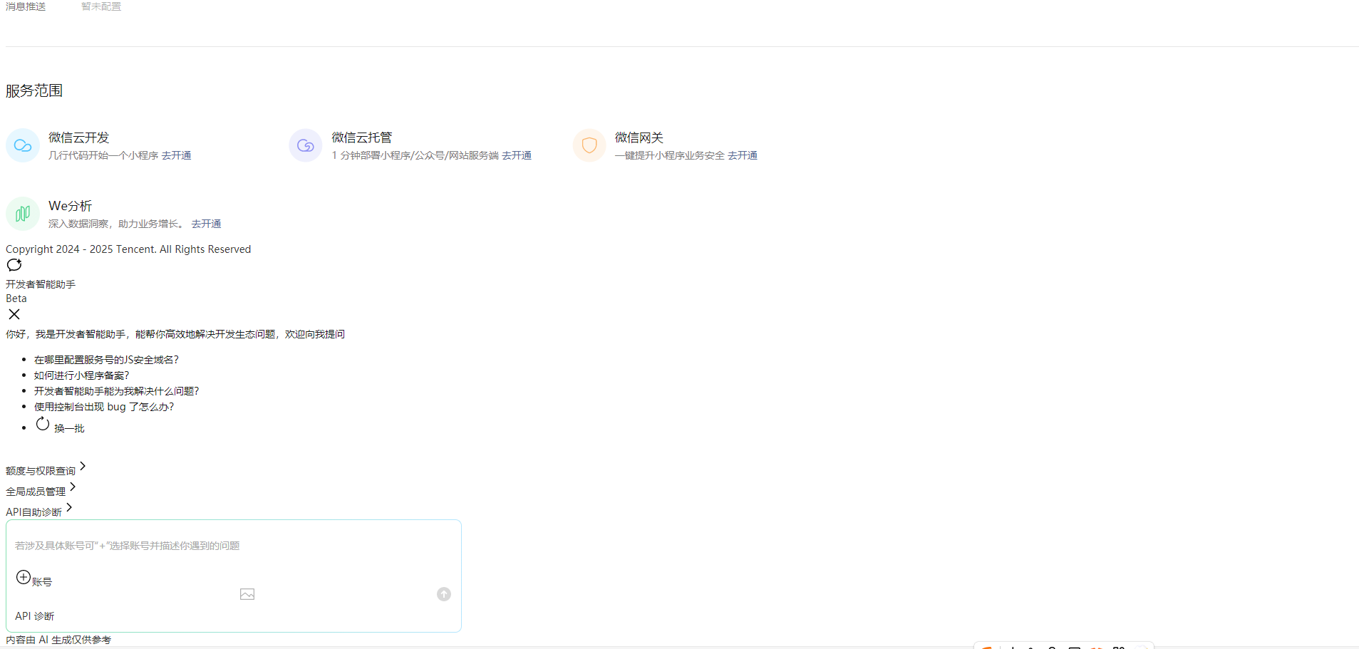 你可以使用微信扫码登录 微信开发者平台 即可发起与 AI 助手的对话,如下截图: