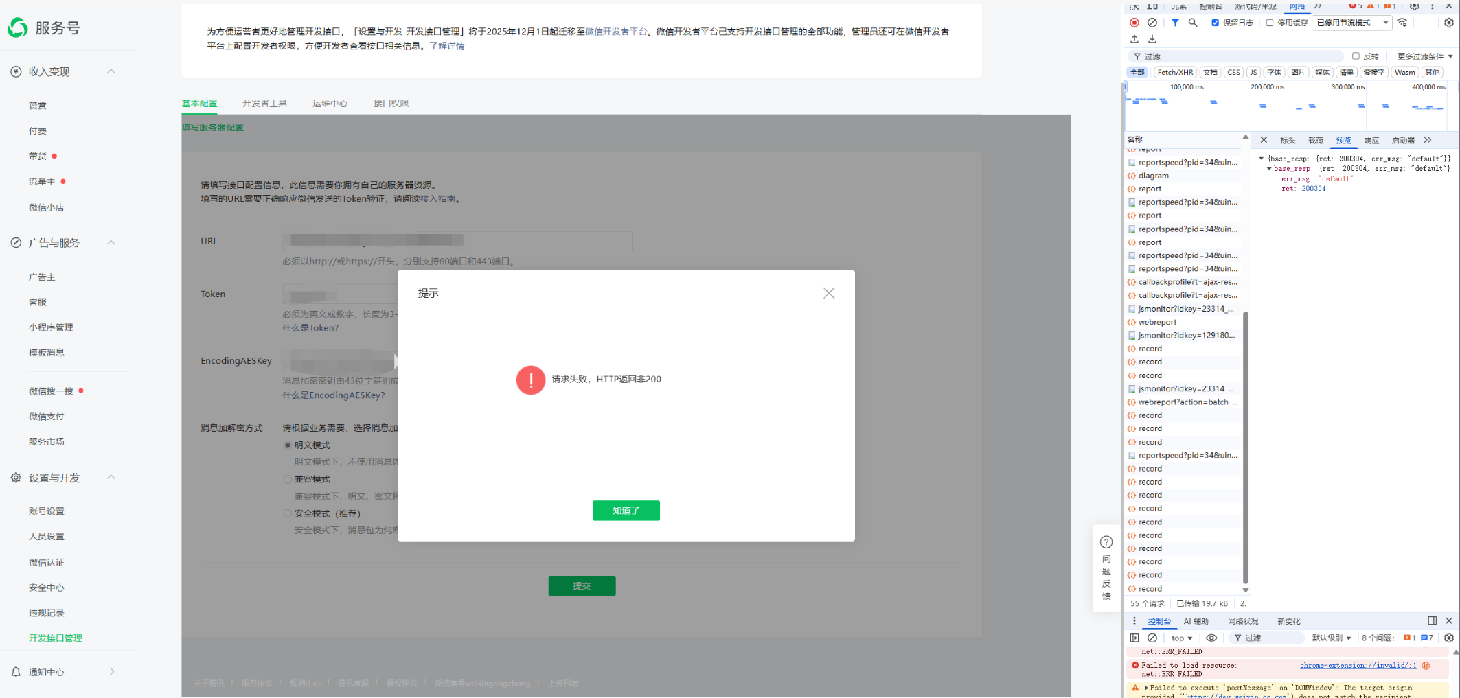 功能不可用,直接浏览器输入配置的URL是可以正常响应200的,但是这里配置和新的开发者平台配置都提示错误