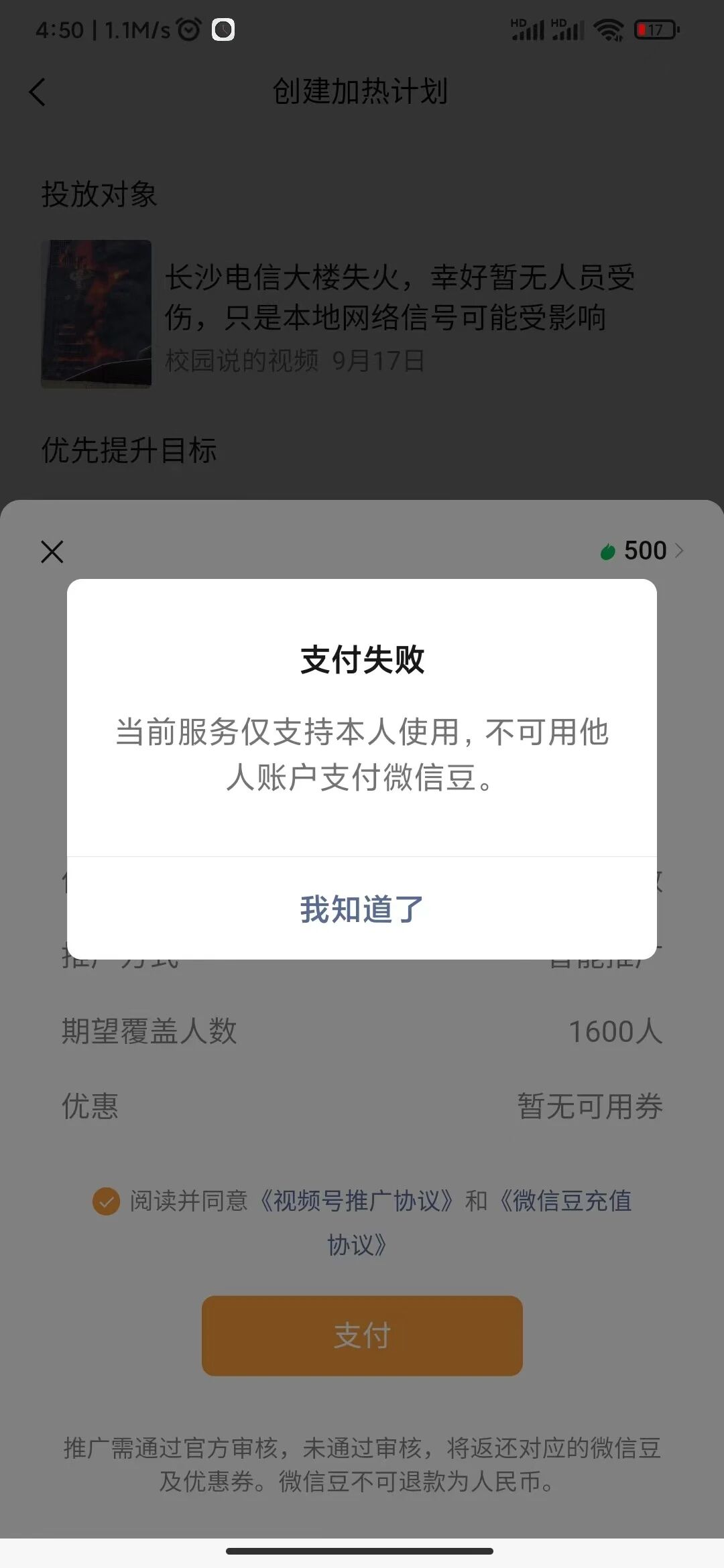 4、问题描述:视频号推广微信豆支付失败提示网络错误