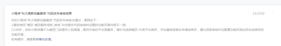 你好,贵方小程序涉及为多家店铺提供外卖的平台型服务,请补充选择餐饮-外卖平台类目,并在基础信息处申请该类目,通过资质审核并在配置功能页添加符合该类目的功能页面。请修改后再提交代码审核。