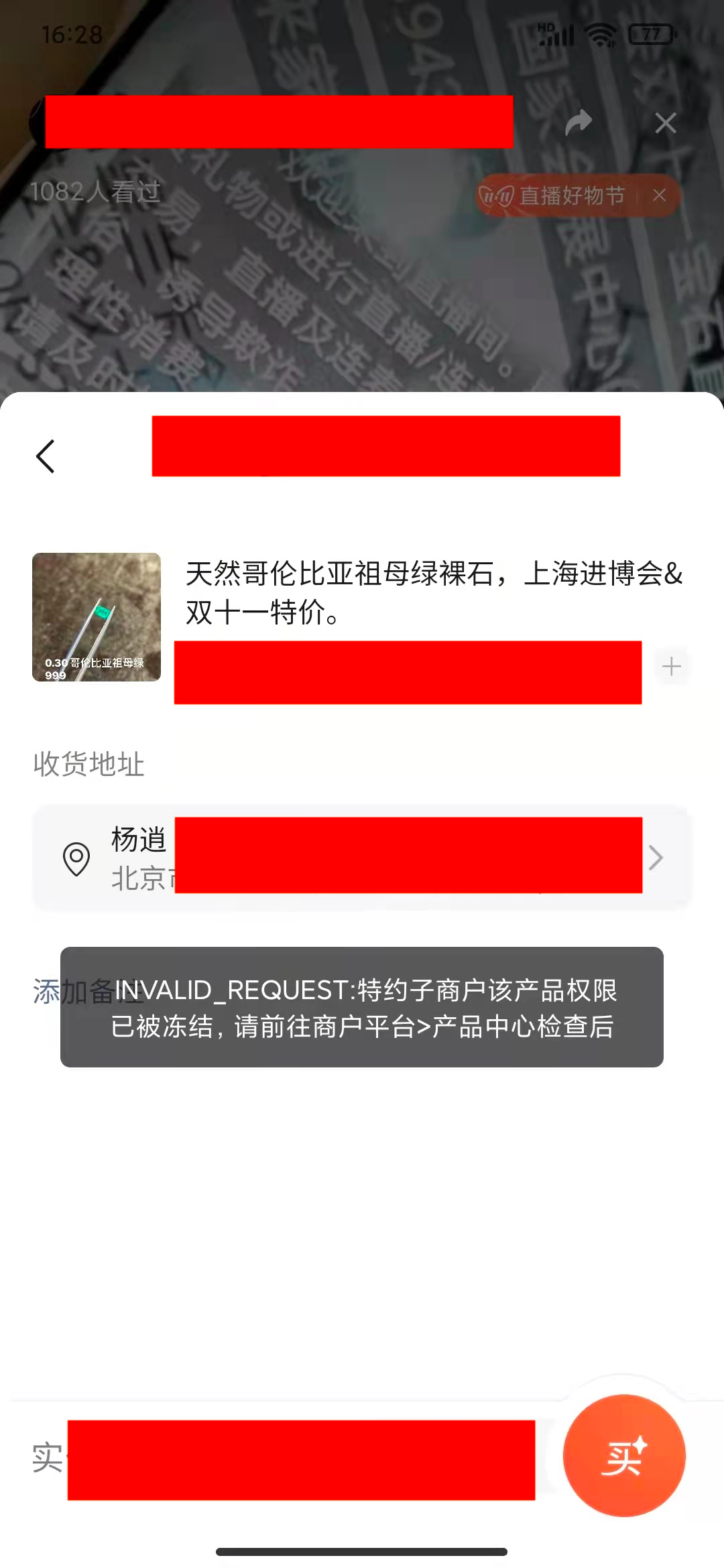 出差到上海参加进博会进行直播,用同事手机异地登陆微信后提示有被盗的风险,无法登陆小商店后台进行管理。直播时不停有客户报无法支付,不停显示invalid_request:特约子商户该产品权限已被冻结,请前往商户平台>产品中心检查。店铺AppID为wx6a36ed653936d8ac。