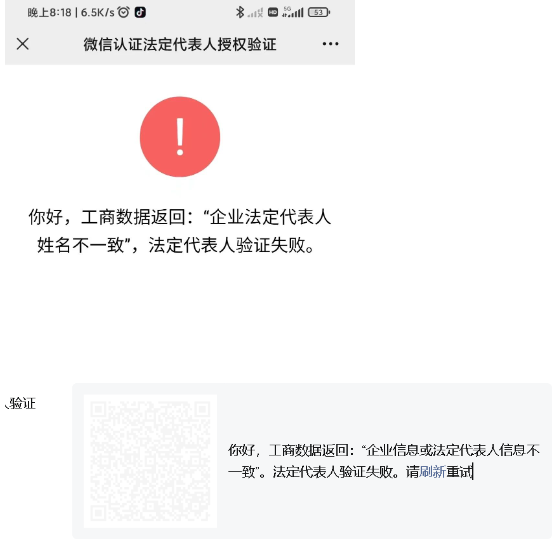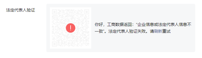 你好,工商数据返回:“企业信息或法定代表人信息不一致”。法定代表人验证失败。请刷新重试