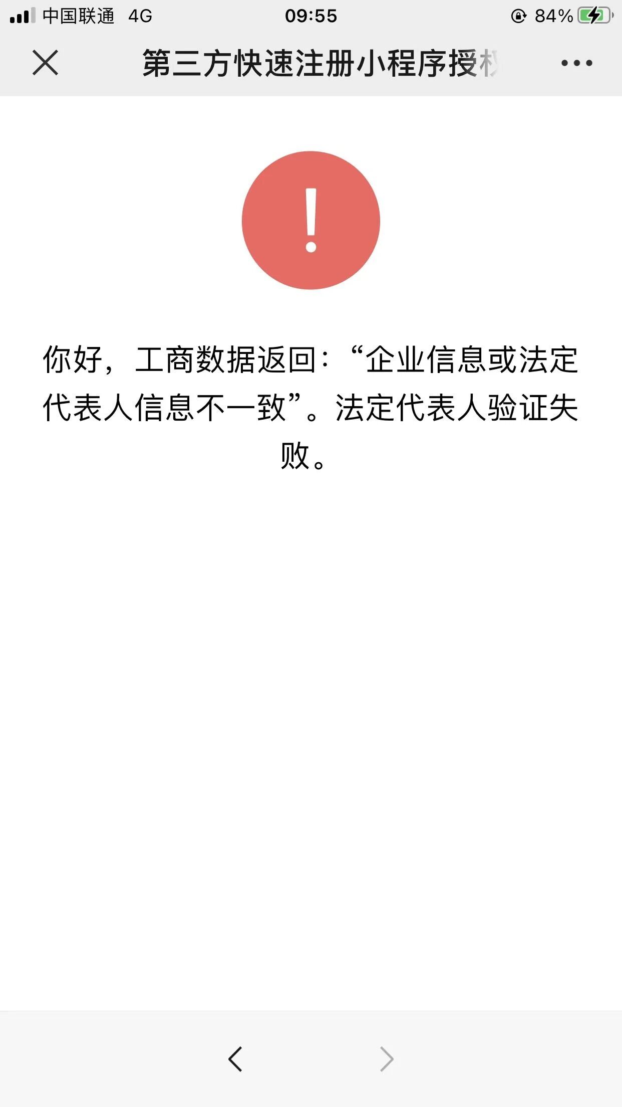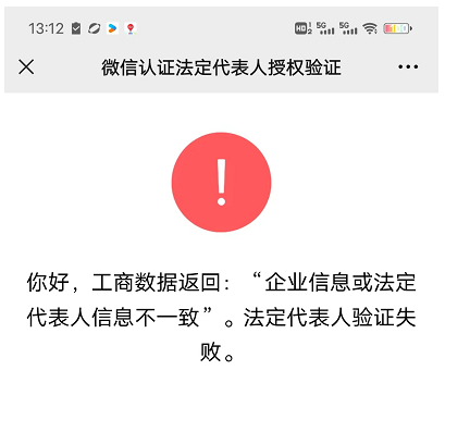 小程序注册,填写完资料后,进行法人代表验证,提示“企业信息或法人代表不一致”验证失败。企业(个体)信息及法人信息都是正确。填写的信息如下图
