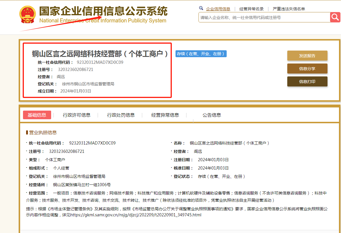 名称:铜山区言之远网络科技经营部(个体工商户)