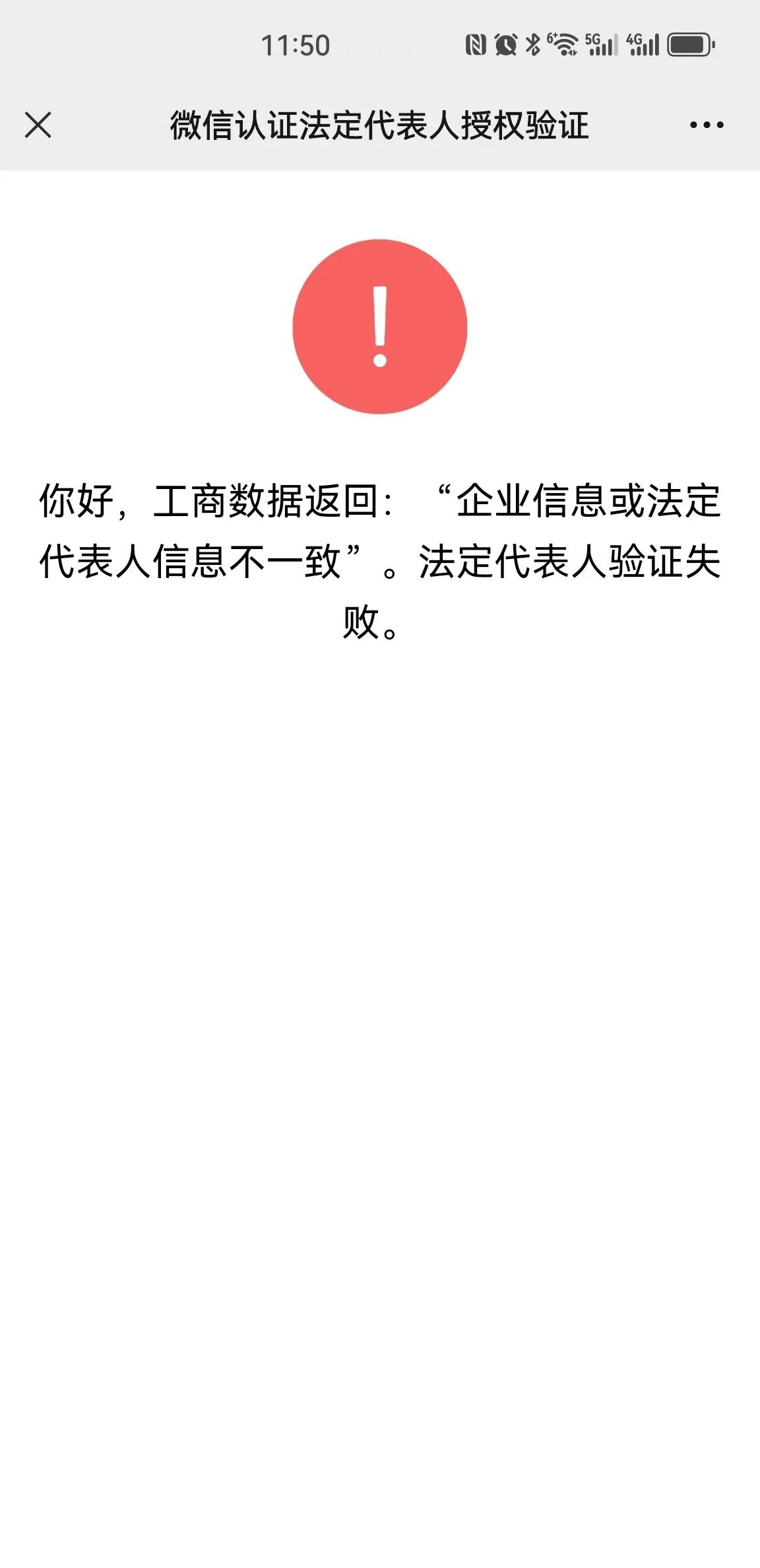 小程序注册,填写完资料后,进行法人代表验证,提示“企业信息或法人代表不一致”验证失败。企业(个体)信息及法人信息都是正确。填写的信息如下图