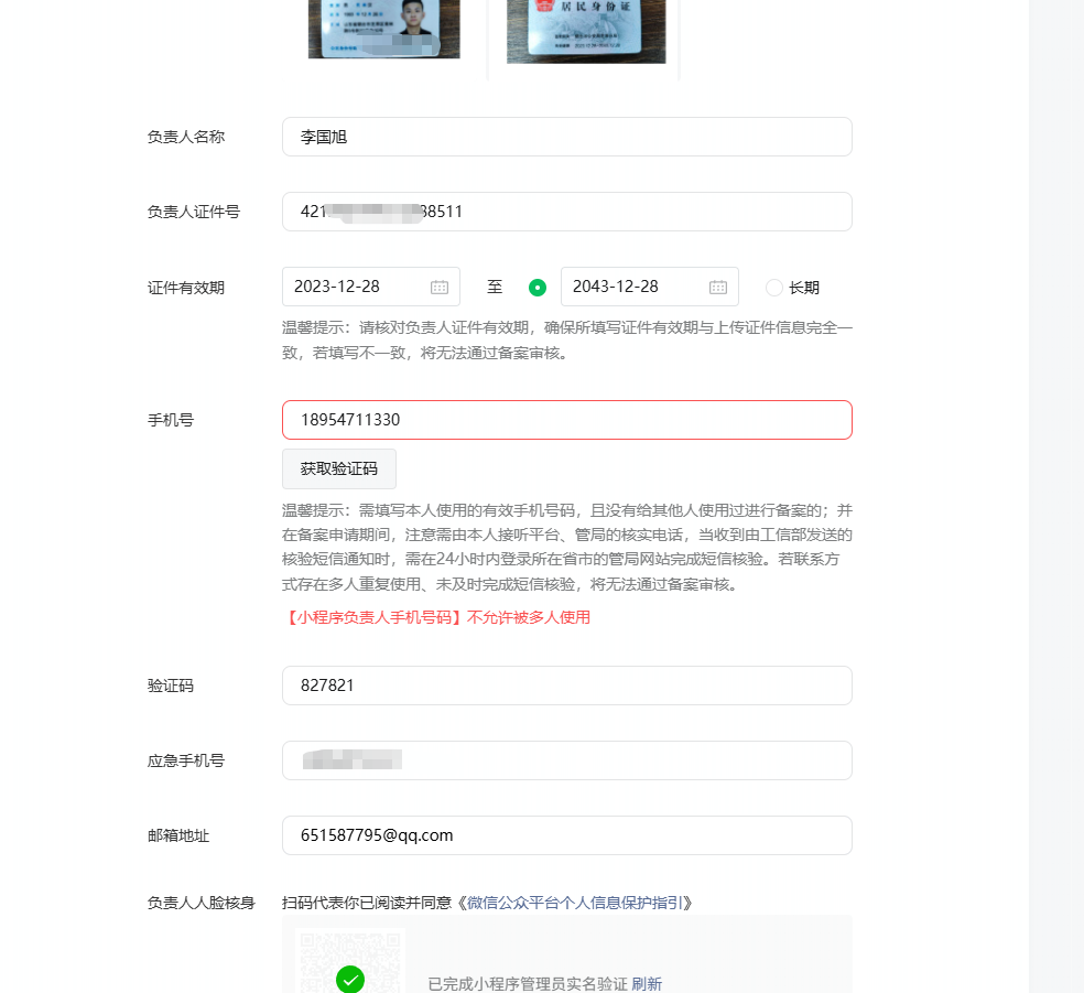 在平台备案系统中,人,手机号,邮箱均一一绑定,同一个人允许为多个小程序备案(同一主体下),可以提交一致的手机号和邮箱,但不能出现不同人共用手机号/邮箱的情况。