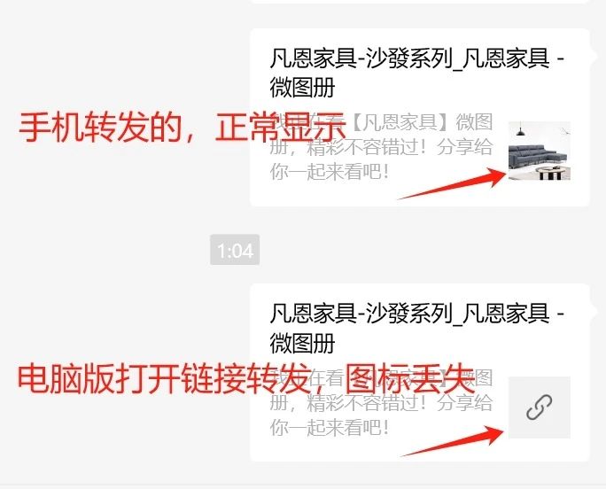 第一张图片是手机分享出来的,第二个是微信电脑端(客户端)是不显示图片的,请问是什么问题?