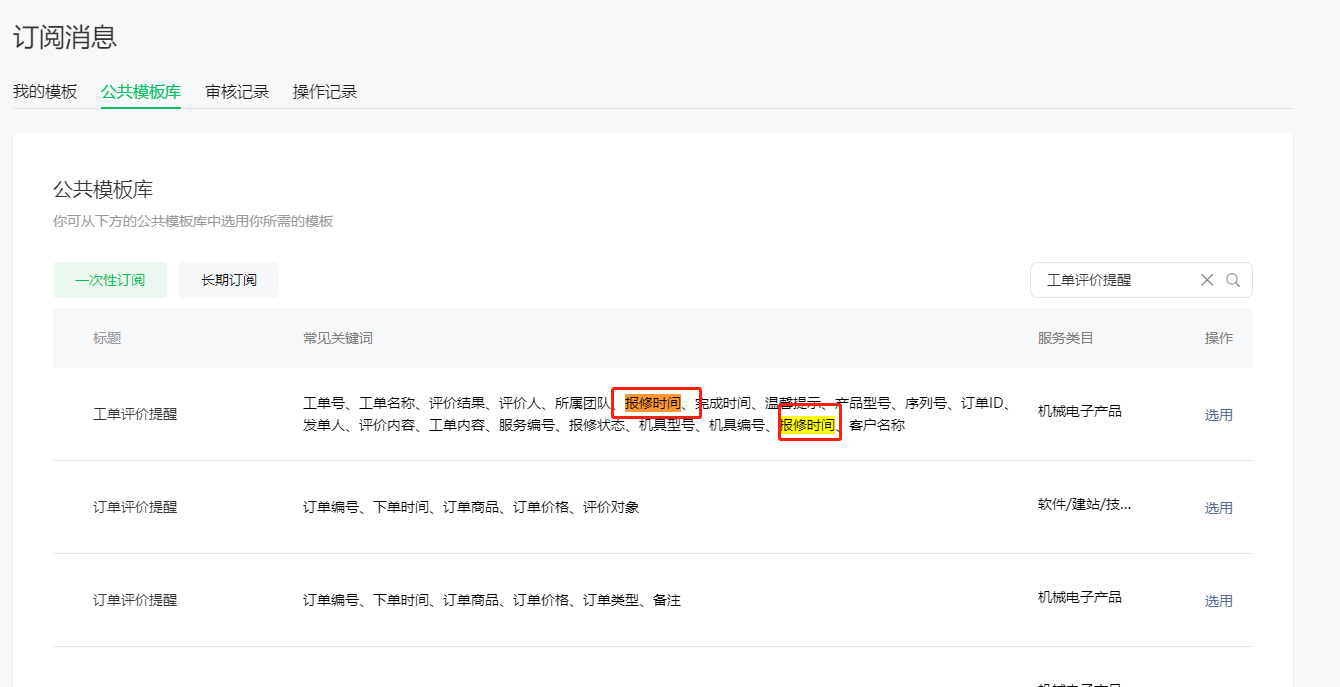 重复字段,勾选会出现两个, 标题"工单评价提醒" ,重复字段, 报修时间