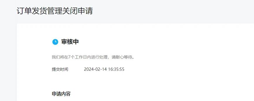 订单发货管理关闭申请审核好久都没关闭?当前小程序不涉及收款,内容是第三方cps推广产品接入,所以发货不是由本小程序决定,申请关闭一直停留审核中,过了7个工作日了