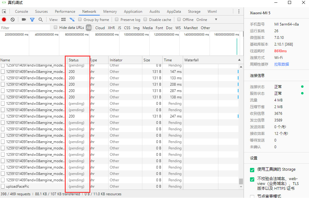 然后通过真机调试,在桌面调式工具查看网络请求,可以发现请求频率不受控制导致请求过多严重阻塞进程。