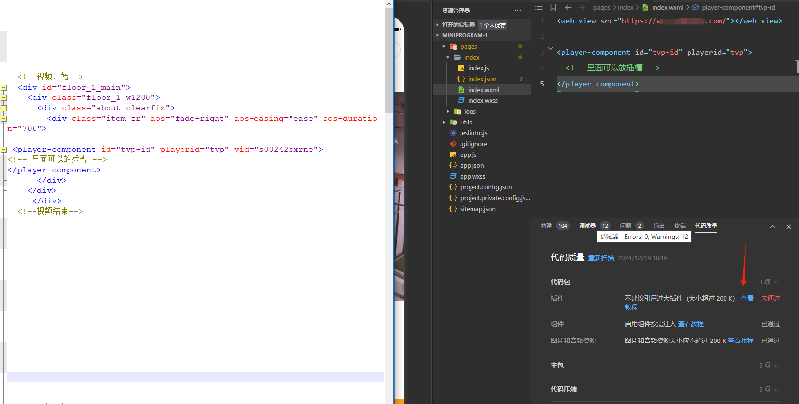 另外,在使用微信开发者工具编译,提示:不建议引用过大插件(大小超过 200 K) ,未通过,是不是因为没通过导致页面没法显示视频呢?
