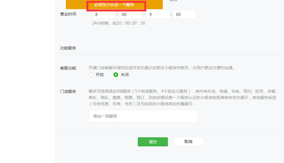 我这边开启客服功能,它仍然提示必须至少认证一个服务