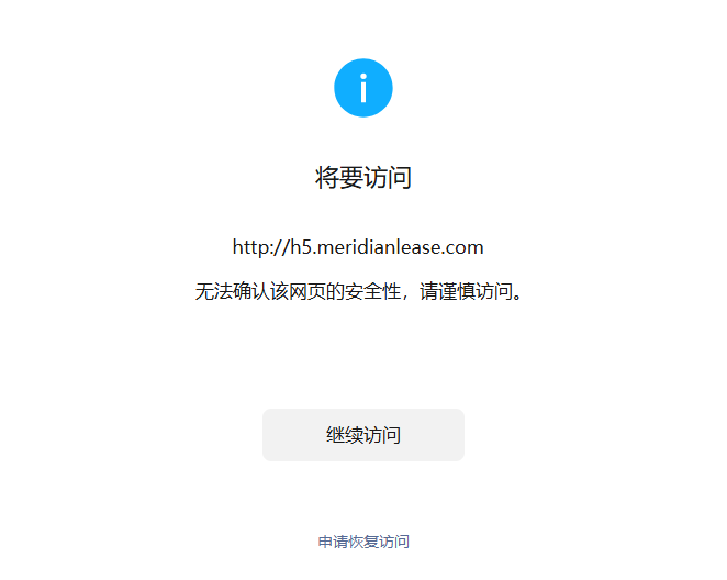 您好,域名(http://h5.meridianlease.com)域名在腾讯云注册并备案通过,服务器也在腾讯云,浏览器访问正常,我是网站开发者,访问时间如图微信访问网站出现“无法确认该网页的安全性,请谨慎访问”,经检查网页里没有不安全的内容,请核实后帮忙解除拦截,谢谢!