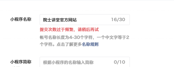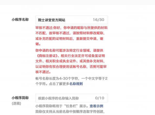 我申请的“院士讲堂官方网站”小程序名称审核不通过,我们没有商标注册证,提供什么材料能使用这个名字