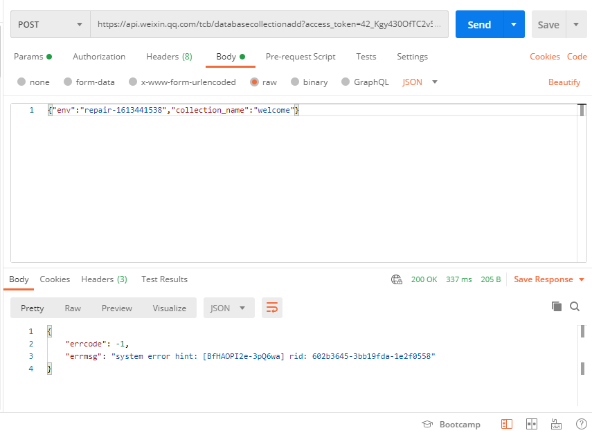 传参为{"env":"repair-1613441538","collection_name":"welcome"}