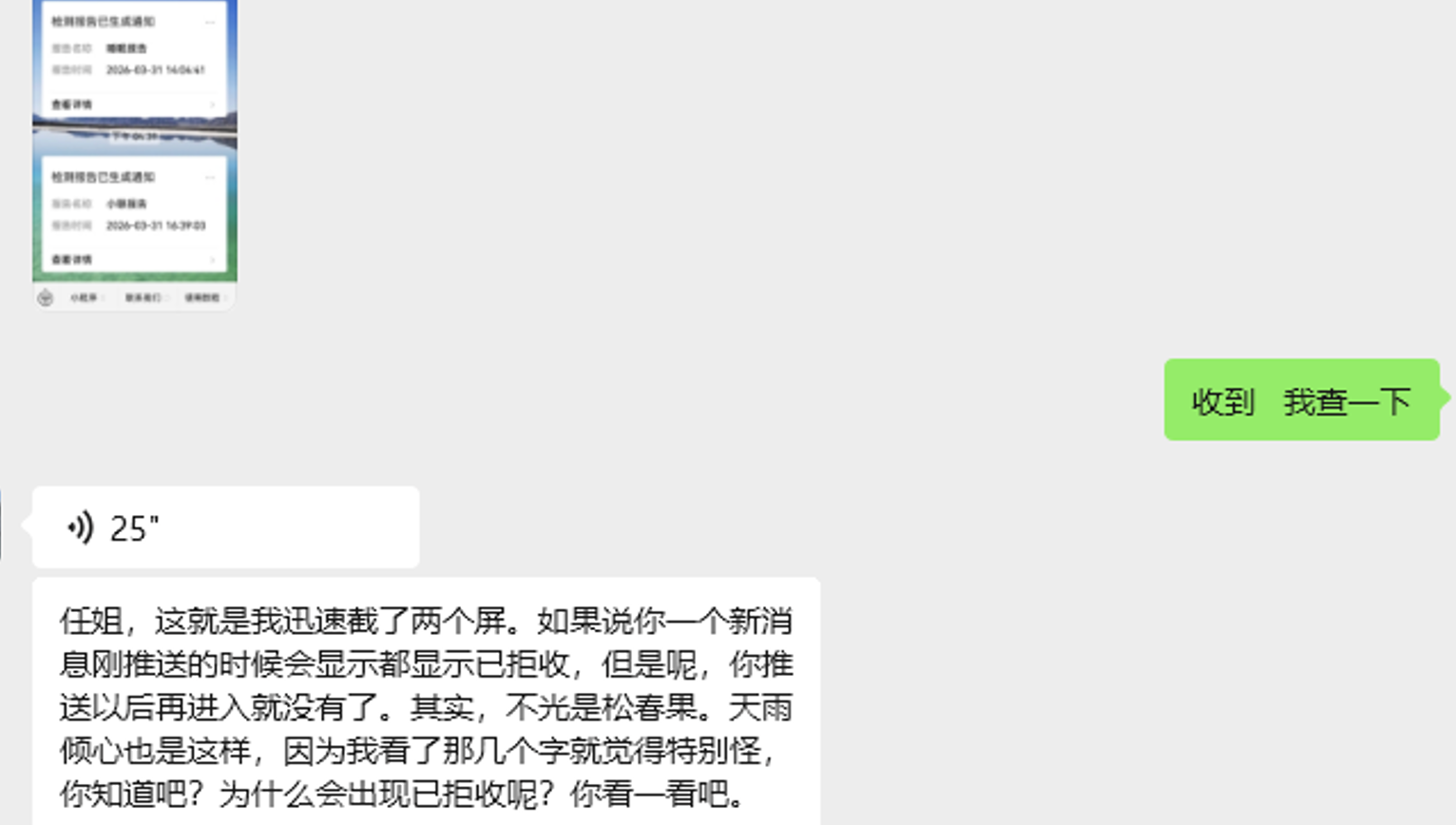 你好,我的微信自动设置了已拒收,现在收不到信息推送,手动恢复接收后微信会自动调整为拒收状态。相关日志已上传,微信号为wxid_re437qssbrgm21