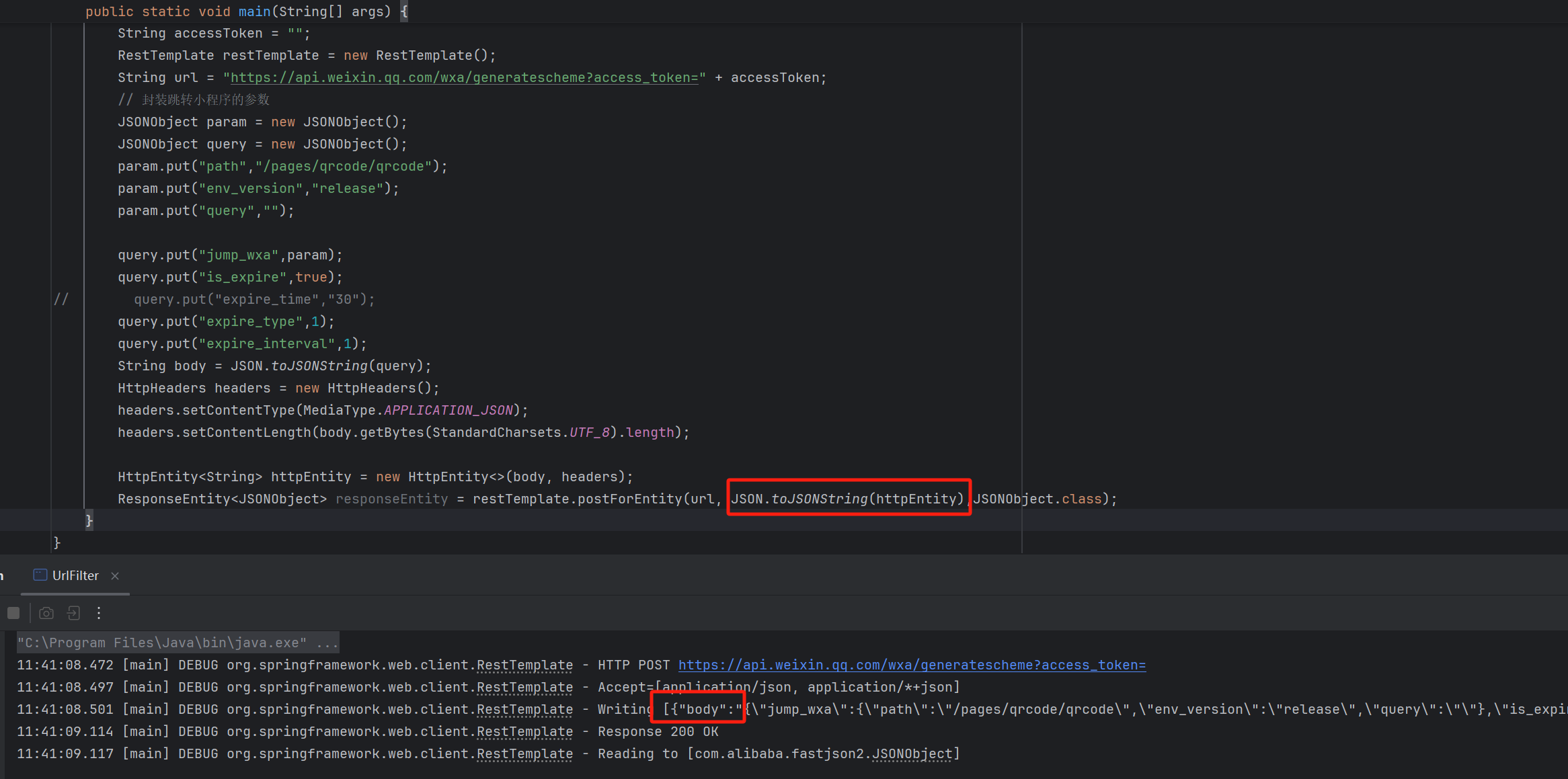 String url = "https://api.weixin.qq.com/wxa/generatescheme?access_token=" + accessToken; // 封装跳转小程序的参数 JSONObject param = new JSONObject(); JSONObject query = new JSONObject(); param.put("path","/pages/qrcode/qrcode"); param.put("env_version","release"); param.put("query",""); query.put("jump_wxa",param); query.put("is_expire",true); // query.put("expire_time","30"); query.put("expire_type",1); query.put("expire_interval",1); String body = JSONUtil.toJsonStr(query); HttpHeaders headers = new HttpHeaders(); headers.setContentType(MediaType.APPLICATION_JSON); headers.setContentLength(body.getBytes(StandardCharsets.UTF_8).length); HttpEntity<String> httpEntity = new HttpEntity<>(body, headers); ResponseEntity<JSONObject> responseEntity = restTemplate.postForEntity(url,JSONUtil.toJsonStr(httpEntity),JSONObject.class); HttpStatusCode statusCode = responseEntity.getStatusCode(); //状态码 if (Objects.equals(statusCode.value(), 200)) { JSONObject responseJsonBody = responseEntity.getBody(); //响应体 assert responseJsonBody != null; log.error("responseJsonBody={}",responseJsonBody); return responseJsonBody.getStr("openlink"); }else{ log.error("请求微信服务器状态码错误"); return null; }假的,按文档代码就能写对了?代码也不亮