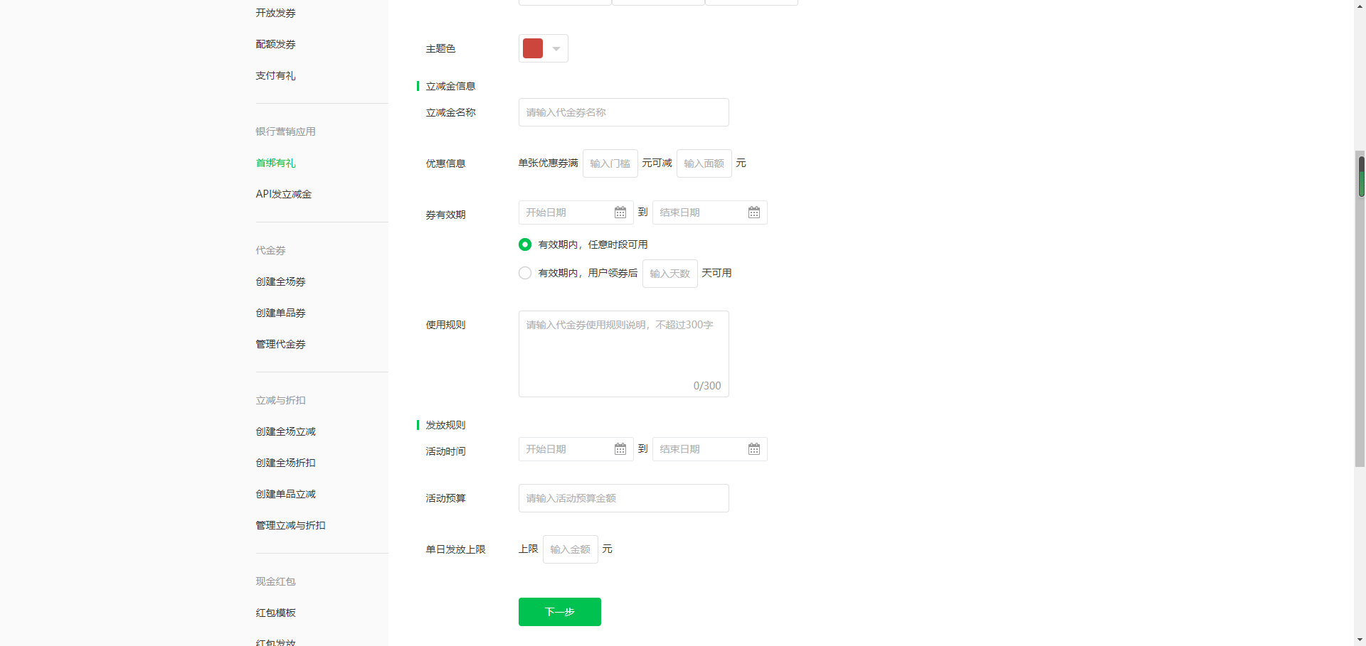 微信营销活动银行首绑有礼活动,创建如何设置指定商户号能使用立减金?后台没有设置的地方,请问这个能设置吗?@支付技术助手8