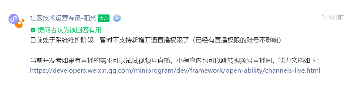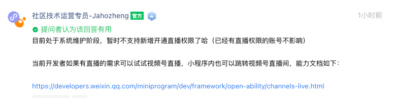 当前如果有直播的需求可以试试视频号直播,小程序内可以跳转视频号直播间,能力文档:https://developers.weixin.qq.com/miniprogram/dev/framework/open-ability/channels-live.html