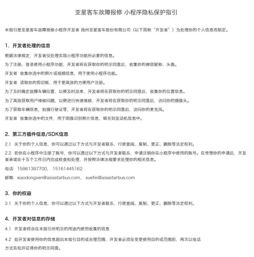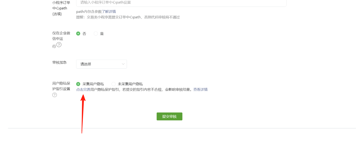 建议你在代码提审页面底部完善【用户隐私保护指引】,审核通过且发布上线后即可生效。
