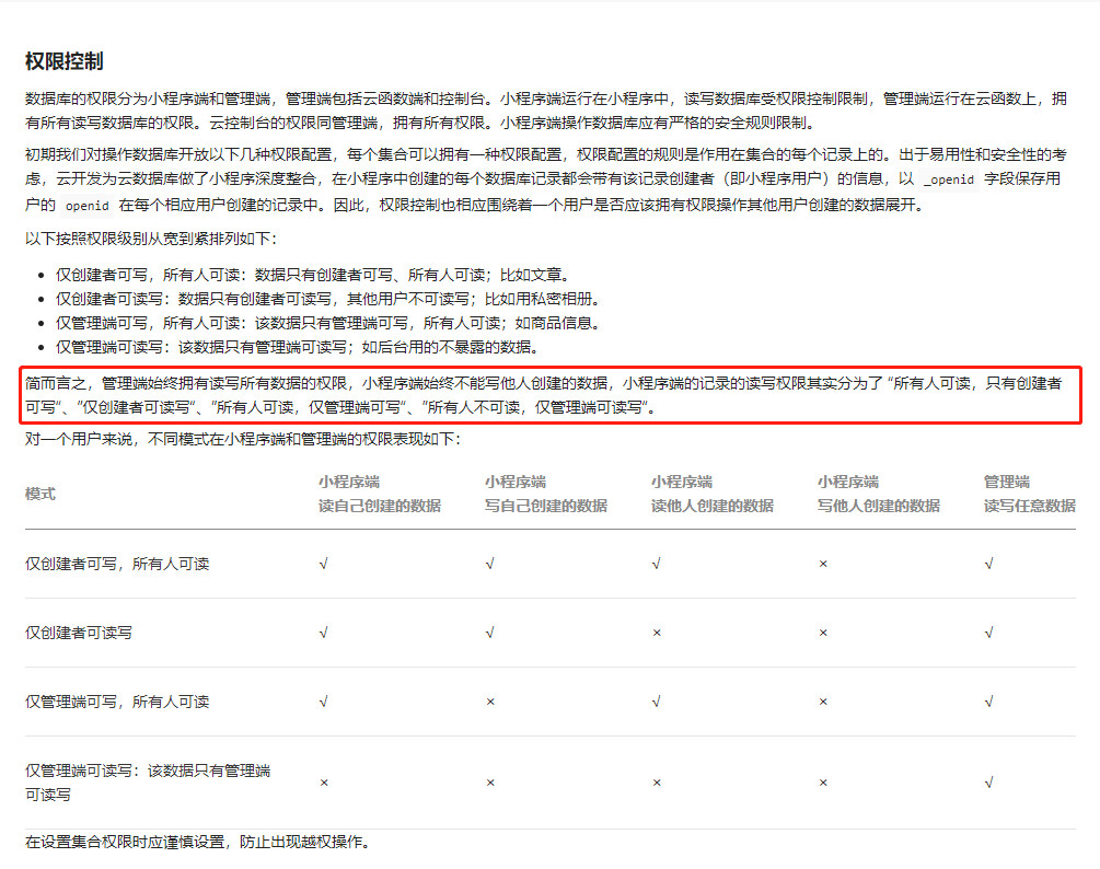 这个权限仅在小程序端生效,在管理端(云函数端、控制台)不生效。