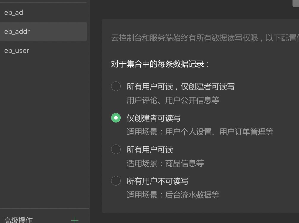 本地有两个开发帐号,调用同一个数据库(eb_addr),两个开发帐号都可以读取对方创建的数据,那要该权限有什么用呢?