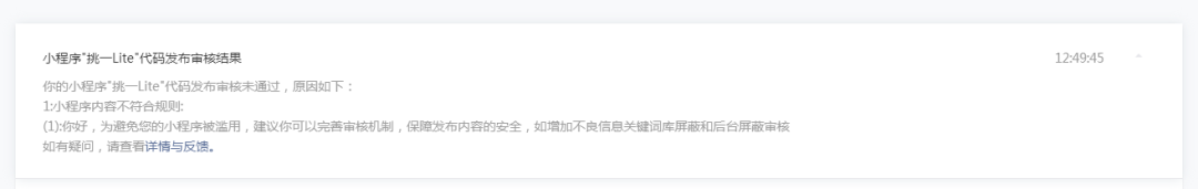 我司小程序新版本V1.0.3,已加入不良信息关键词屏蔽和举报功能,完善了内容审核机制。于18年5月2日提交了审核,但未通过审核,请问是什么原因呢?求解答。