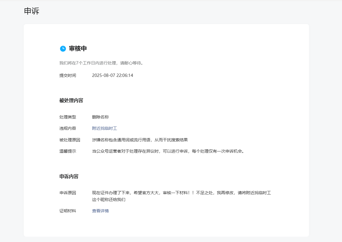 您好,工作人员,我的公众号 原名“附近找临时工” 原始ID:gh_de76dc3fc8ba 在2024年11月11日 被删除昵称,我当时联系了客服咨询原因,客服告知我公司缺少人力资源许可证,于是我们就紧锣密鼓 一步一步的去办理 ICP证 有了ICP证 才能办理了网络招聘等中介的人力资源许可证,现在证件齐全了 !结果今天我再申诉我的公众号昵称的时候总是提交失败,我查看后得知过了申诉时间,希望官方再给我开通这个公众号昵称的申诉链接通道,让我一年东奔西走的辛苦不要白费 ,谢谢谅解,希望让我们老百姓经营起来不要那么多的困难重重,麻烦工作人员,尽快帮我们处理一下,趁着现在我这个原昵称没有被别人使用,给出解决的思路,感激不仅!
