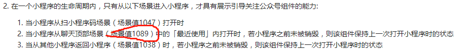 在一个小程序的生命周期内,只有从以下场景进入小程序,才具有展示引导关注公众号组件的能力: