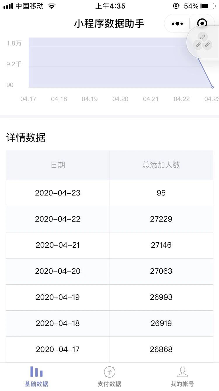 你好,近期对小程序“添加人数”进行了统计优化,具体内容如下: 原“总添加人数”为未去除“删除添加人数”的数据;目前将其调整为去除“删除添加人数”的数据; 请开发者留意,具体统计方式以下方数据文档中“总添加人数”的解释为准。https://developers.weixin.qq.com/community/develop/doc/0000ceff01c63897c73a56c4c5b409