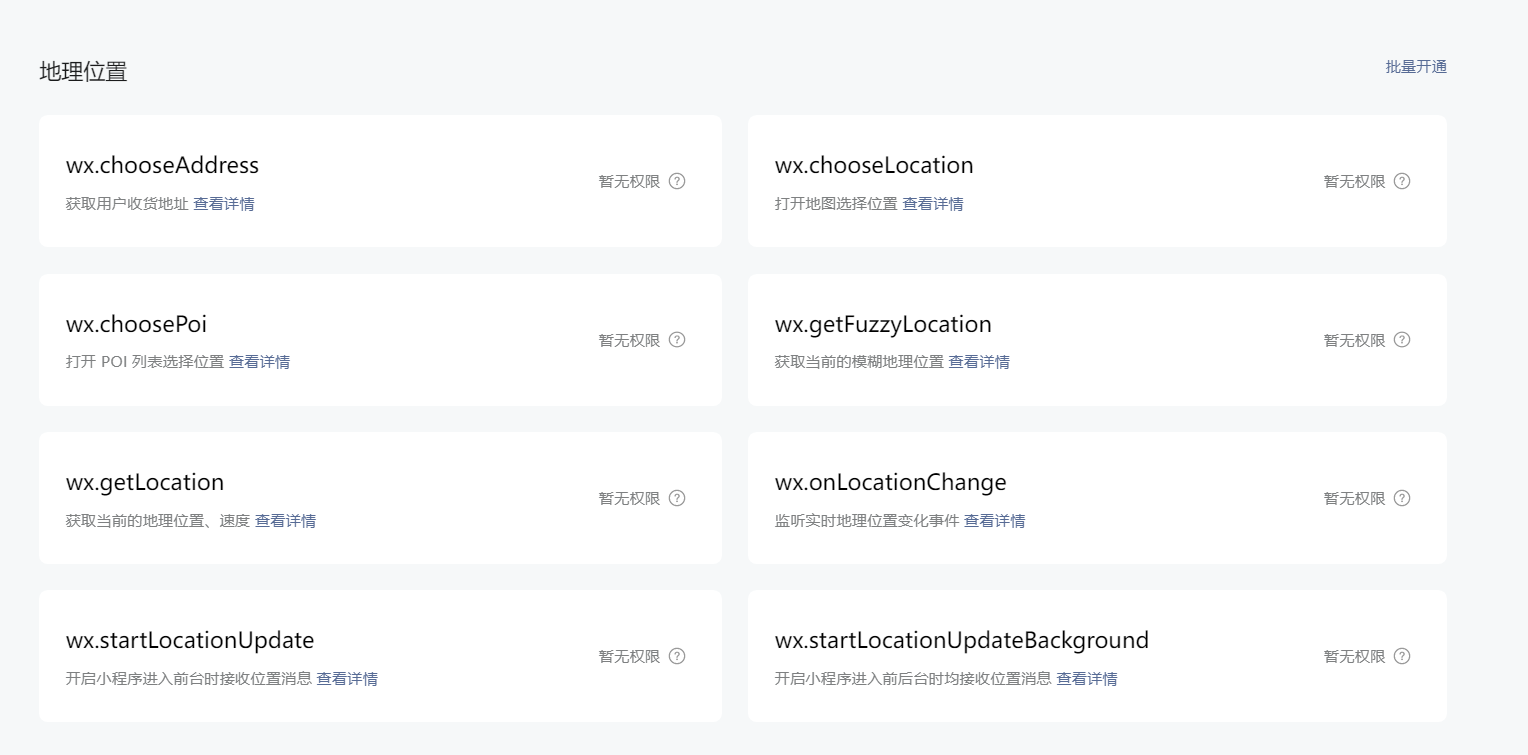 旅游商城,主要售卖旅游门票等,有些套票有实体卡,是需要配送的,并且我的主营类目也是选择的景区服务,是可以开通地理位置API的,但是现在所有的地理位置API都显示暂无权限,是什么回事呢?求解决~~