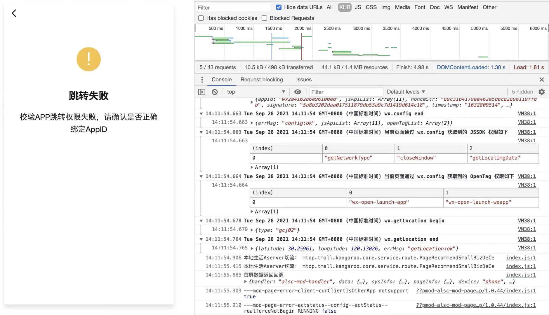 根据微信文档所描述的,微信开放标签接口拥有H5跳转App的能力,目前我们查看是已获得该权限,APP与服务号主体一致,开放平台和服务号均已认证,但是在测试中发现无法唤起App,并且返回报错为