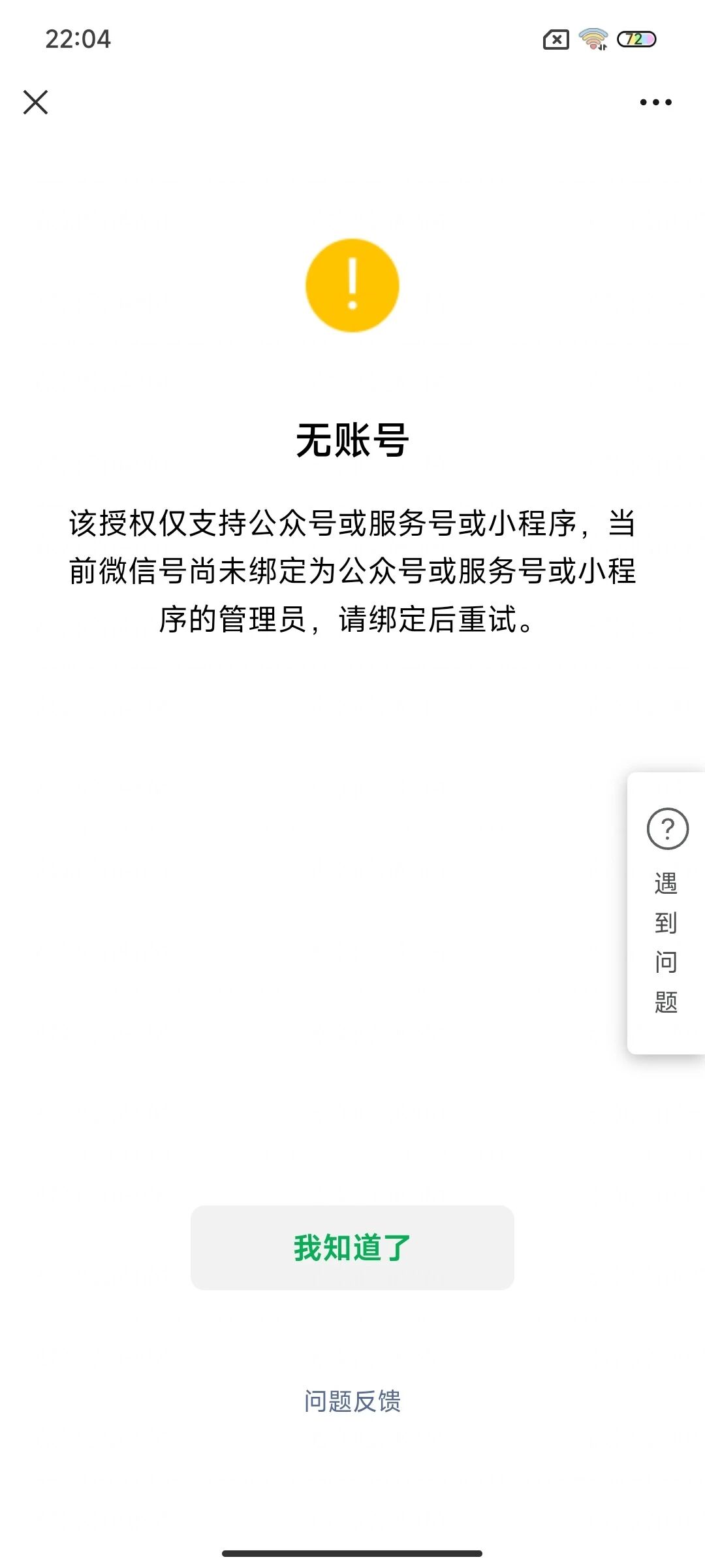 你好,请参考 https://developers.weixin.qq.com/doc/oplatform/Third-party_Platforms/2.0/troubleshooting/authorization_troubleshooting.html#%E4%BA%94%E3%80%81%E5%95%86%E5%AE%B6%E6%8E%88%E6%9D%83%E6%8F%90%E7%A4%BA%E6%97%A0%E6%B3%95%E6%8E%88%E6%9D%83%E3%80%81%E6%97%A0%E8%B4%A6%E5%8F%B7 自助排查