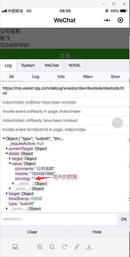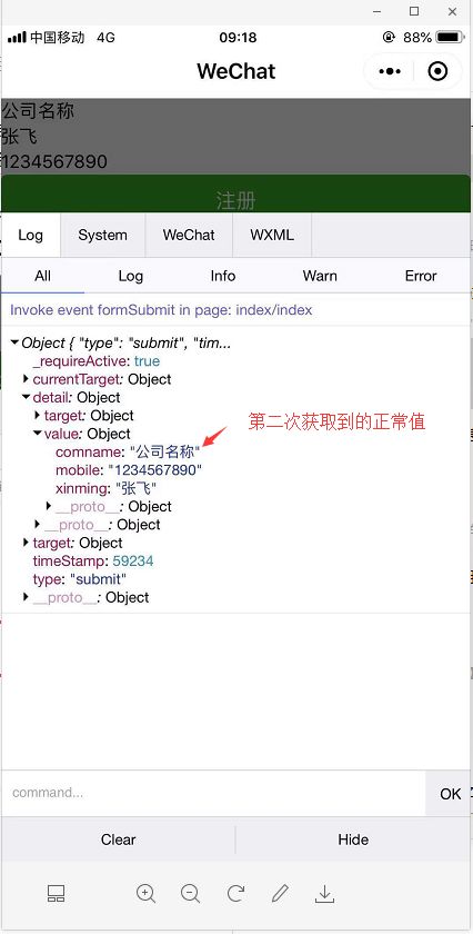 通过form提交表单的时候能获取到输入框的所有值。在真机上第一次输入内容点击“注册”会有部份值丢失,第二次点击文本框使其获得焦点后再点击“注册 ”就能获取到输入值。