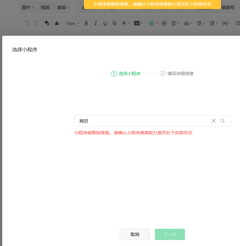 我也有和小程序显示:小程序涉嫌违规,被搜索功能已被限制,不知道是不是没交保证金导致的,过几天等新版本上线,把保证金交了看看