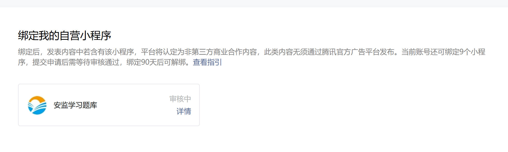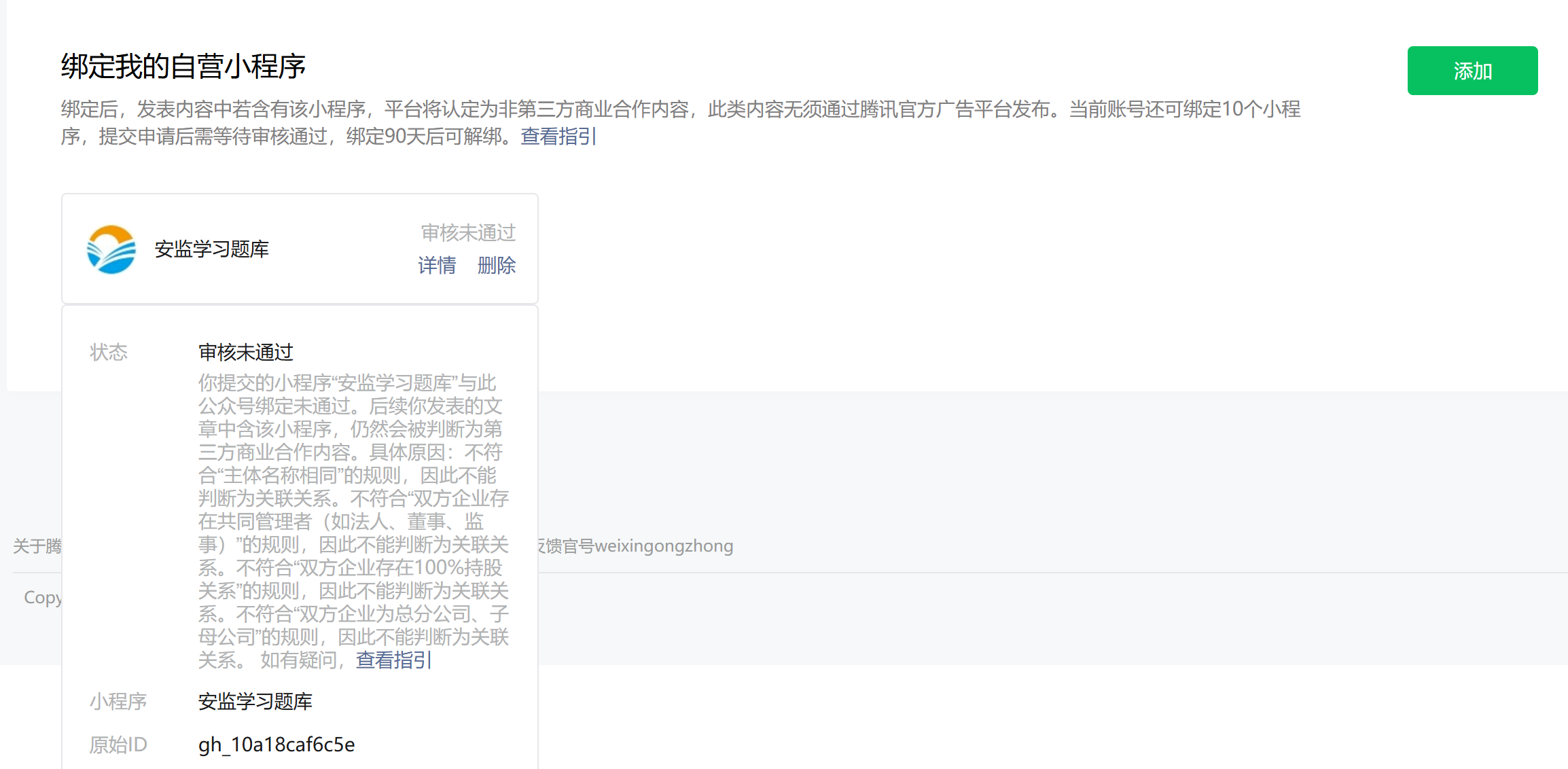 “绑定 安监学习题库 小程序( AppID:wxacfc39fb00e88377)到服务号时绑定失败,无明确驳回原因”。