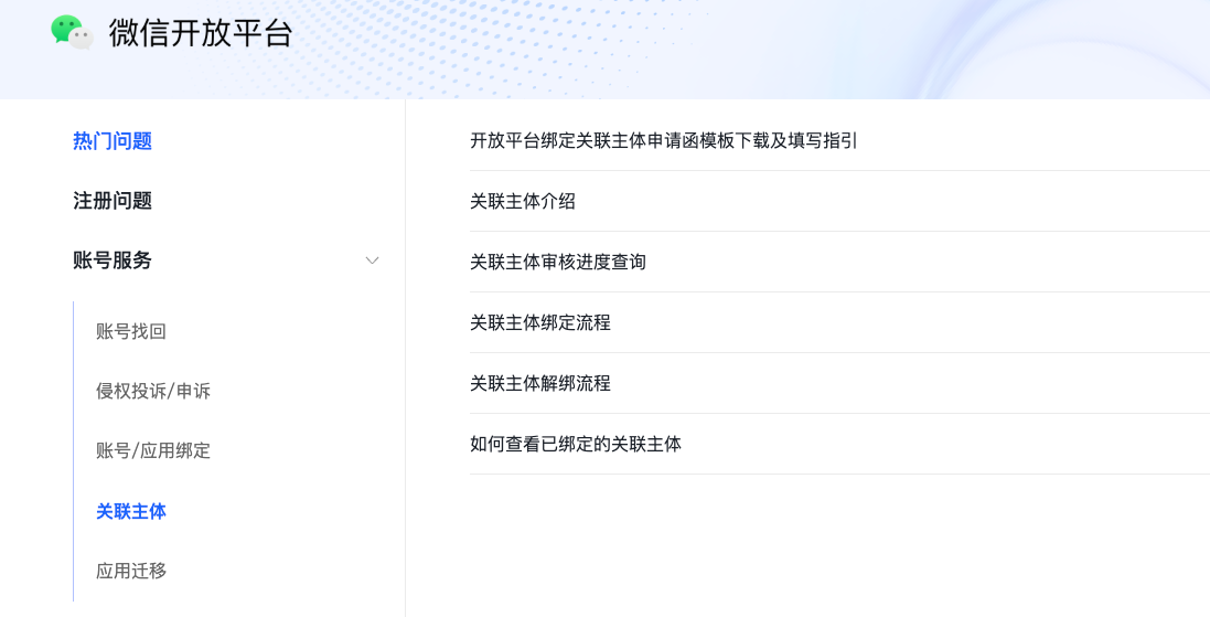 关联主体指的是在微信开放平台(https://open.weixin.qq.com)下操作关联企业,可以参考相关文档:https://kf.qq.com/product/wxkfpt.html#hid=2929