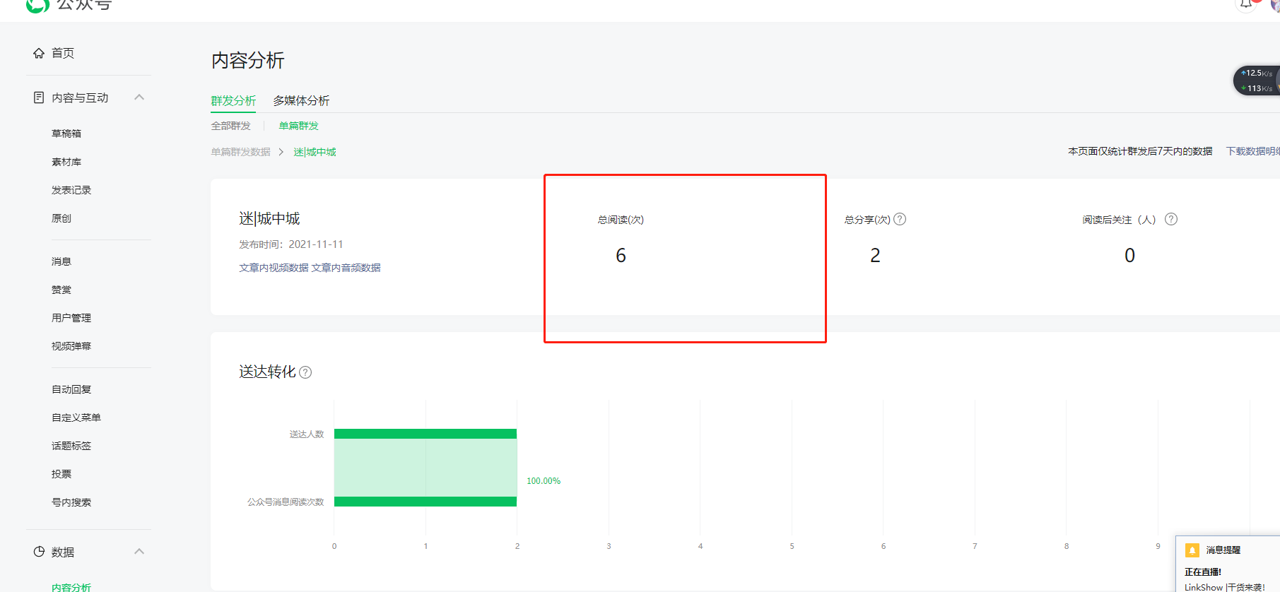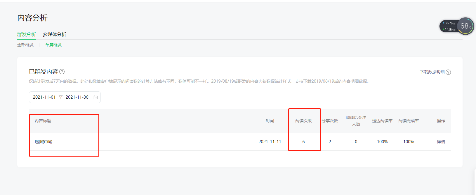 并且在文章底部的阅读量就是单篇群发中的阅读次数量