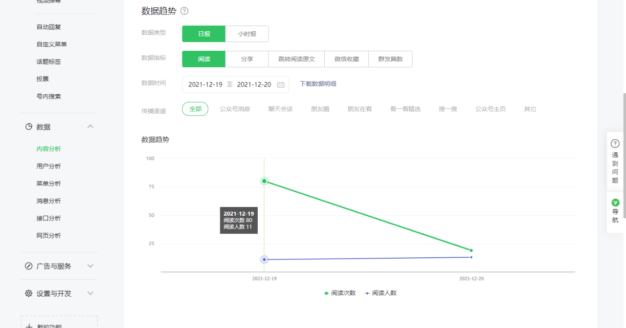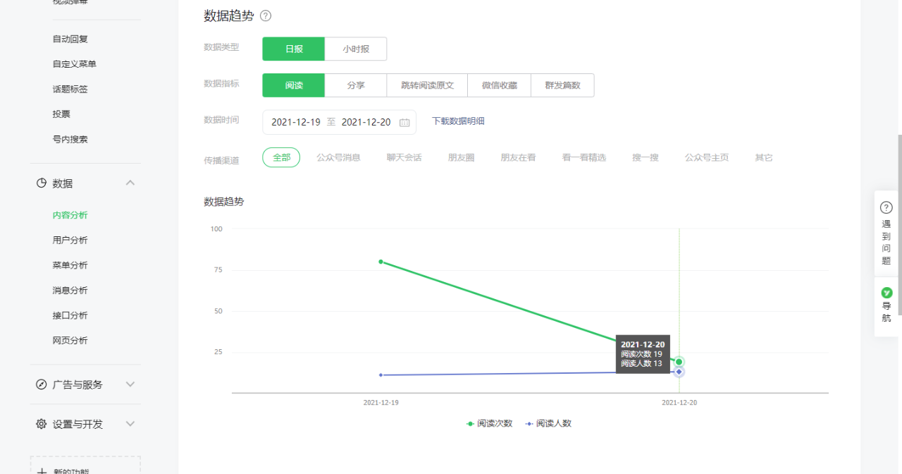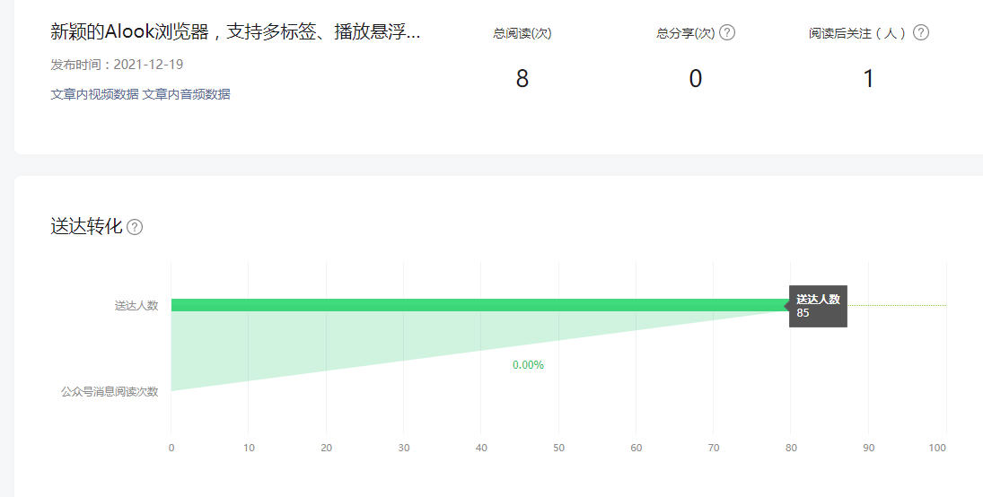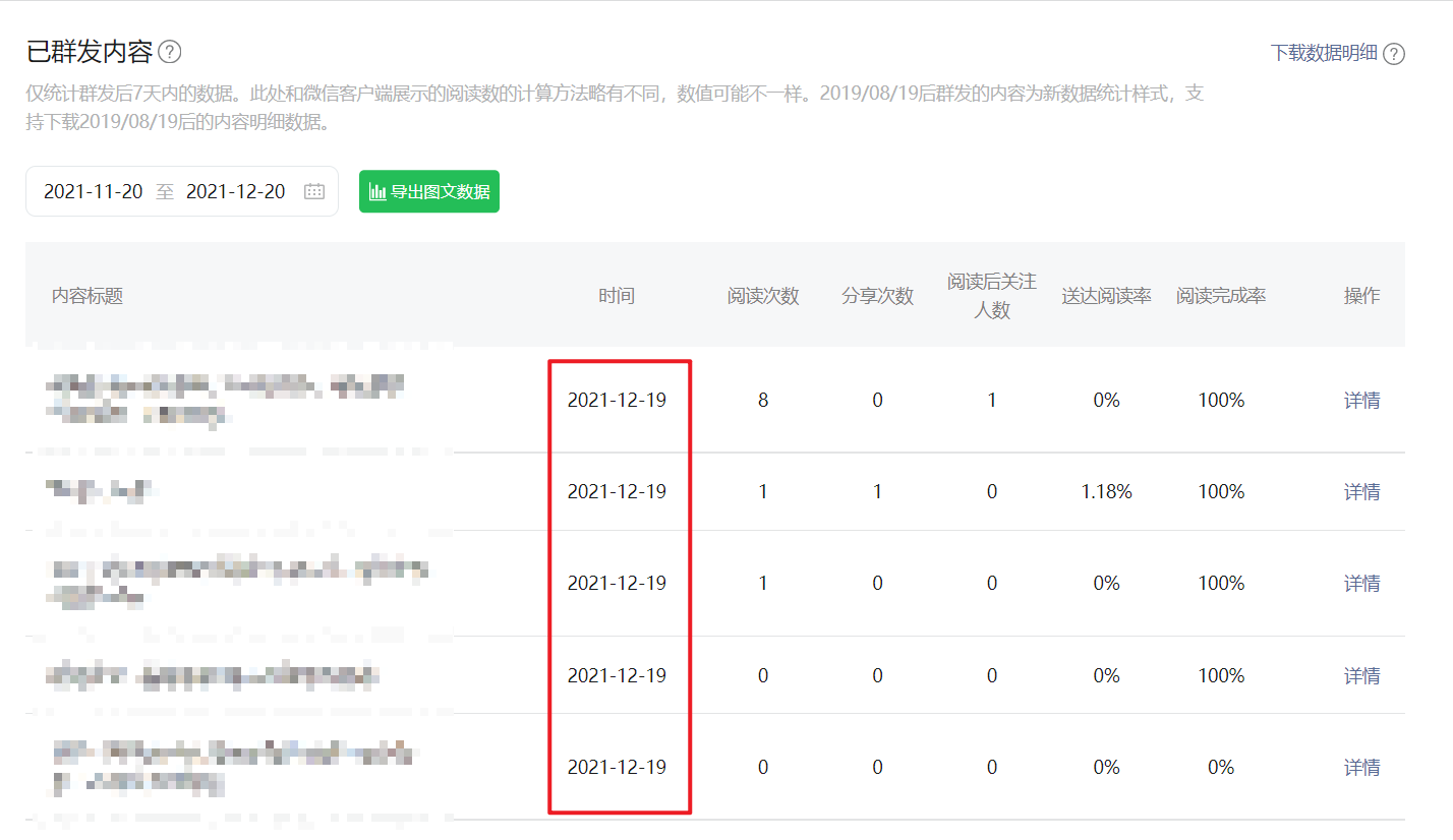 二、但在单篇群发的统计数据好像不正常:截止12月20日统计了总阅读次数为:10次,这里的数据和“订阅号助手”的数据一样