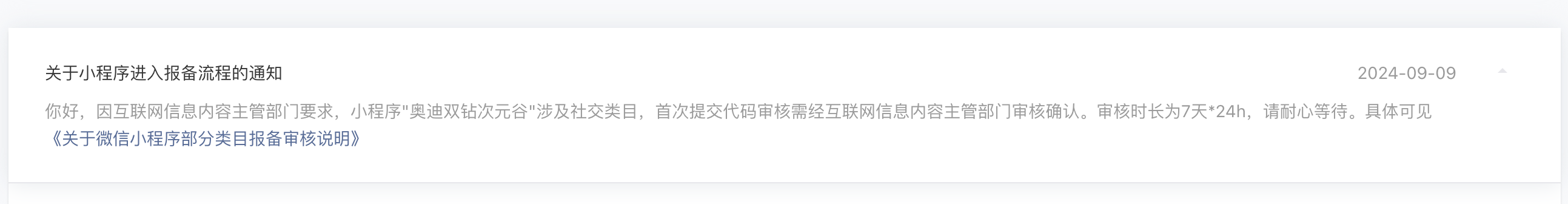 小程序已于【2024-09-16】支持预上线。在预上线期间,属地网信部门仍然可能对小程序进行报备审核反馈。预上线的小程序若存在违规或未允许内容,未通过报备审核,将以站内信的形式通知开发者。未通过报备审核的开发者需要及时下架小程序服务,整改小程序内容。请耐心等待审核结果通知。