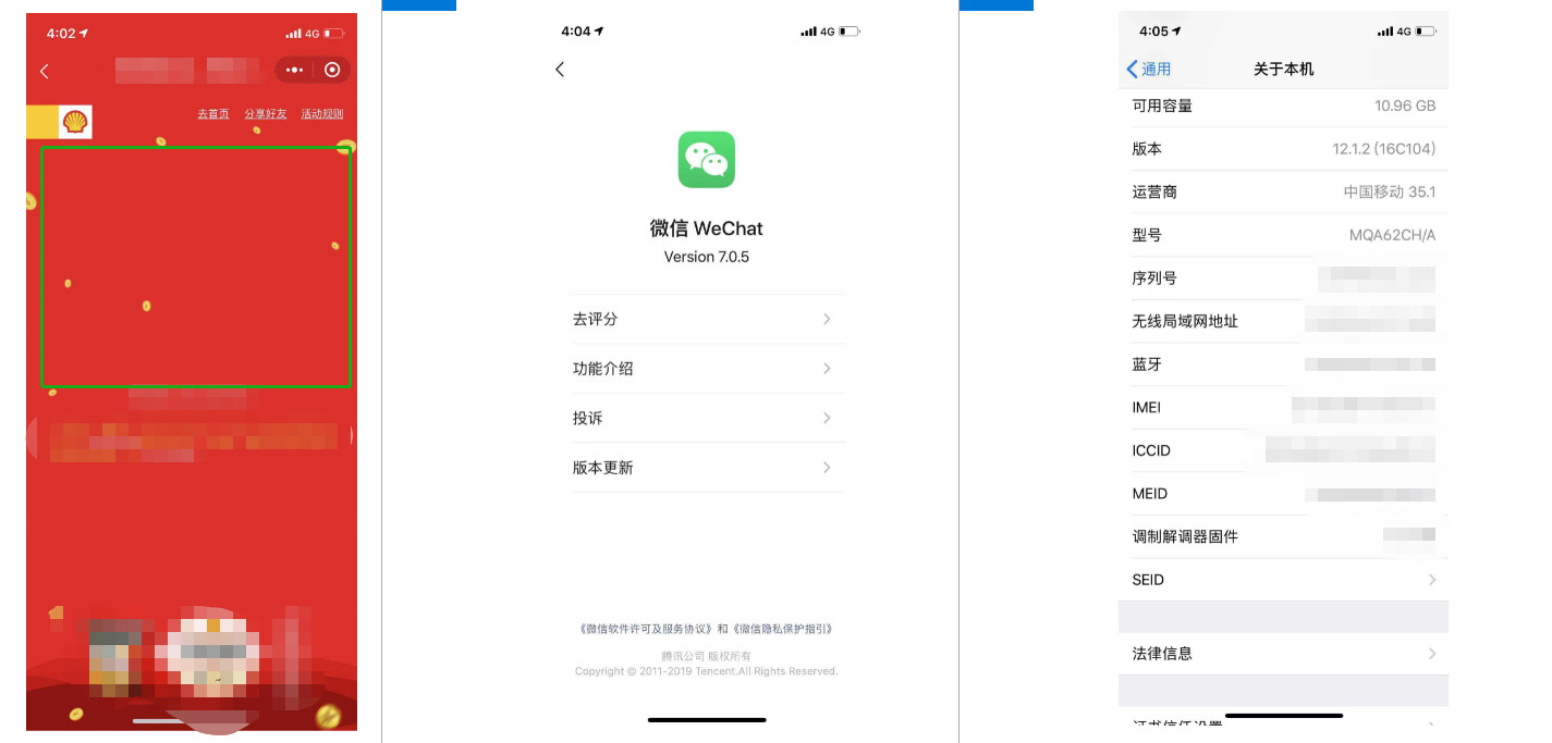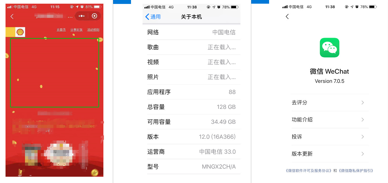 多个iPhone用户反映在使用小程序时部分图片无法显示,严重影响用户体验,请帮忙看一下是怎么回事? 以下提供两个用户的机型、版本、微信版本等信息。 应该是这样的绿框里是有图片的但是部分iPhone用户却没有图片