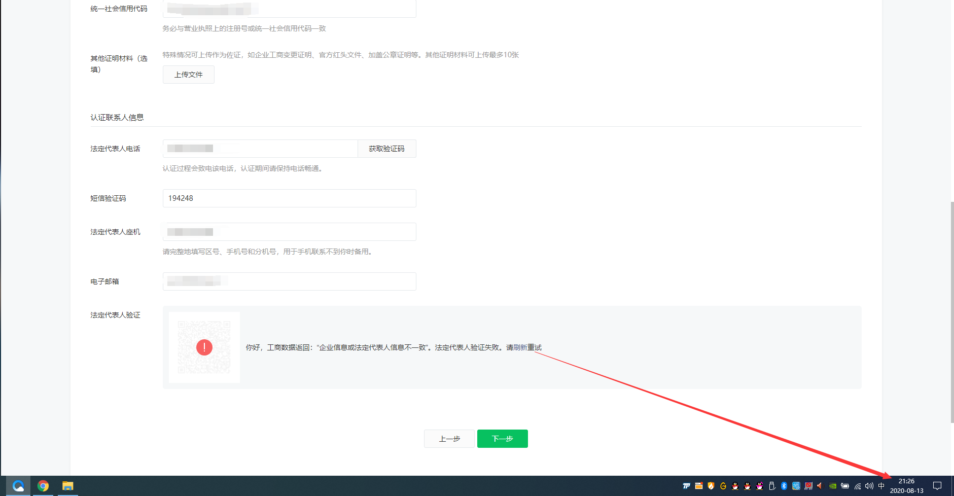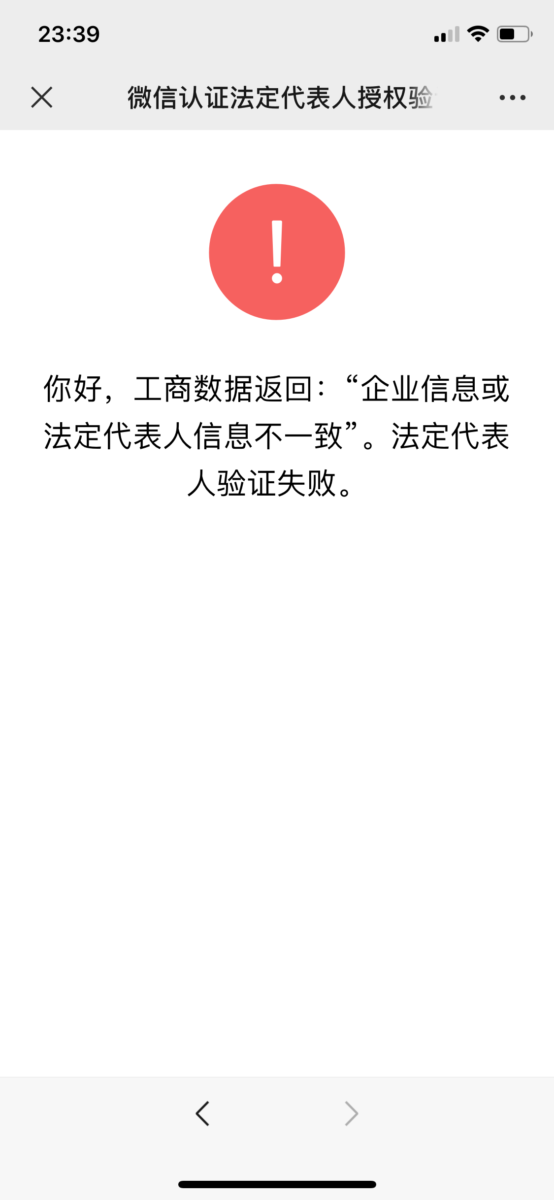 最近在办理个体工商户开通微信公众号,微信公众号平台的通知中心返回“法人代表验证结果通知:法定代表人信息验证失败。原因: "企业信息或法定代表人信息不一致",建议使用其他方式重新注册。”。
